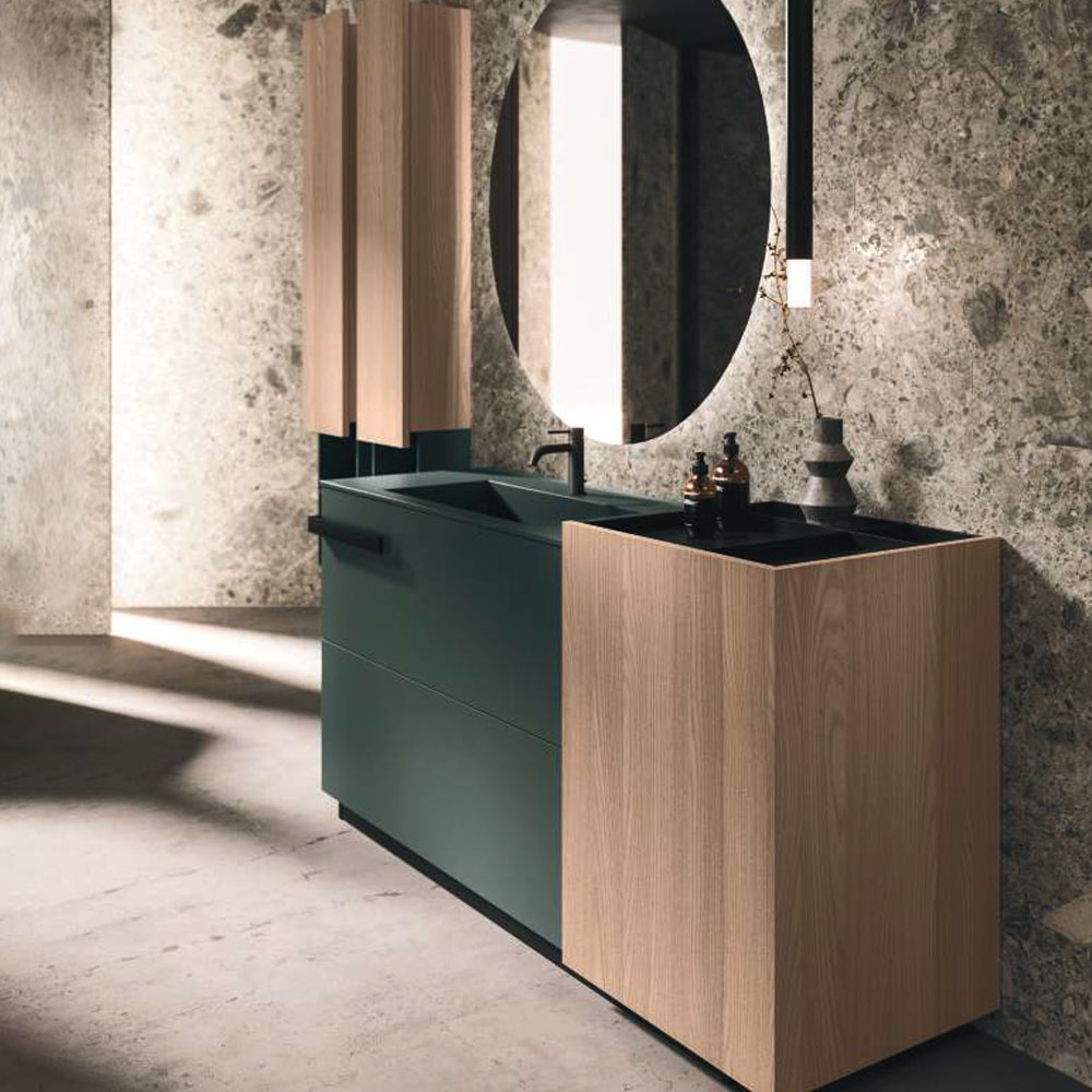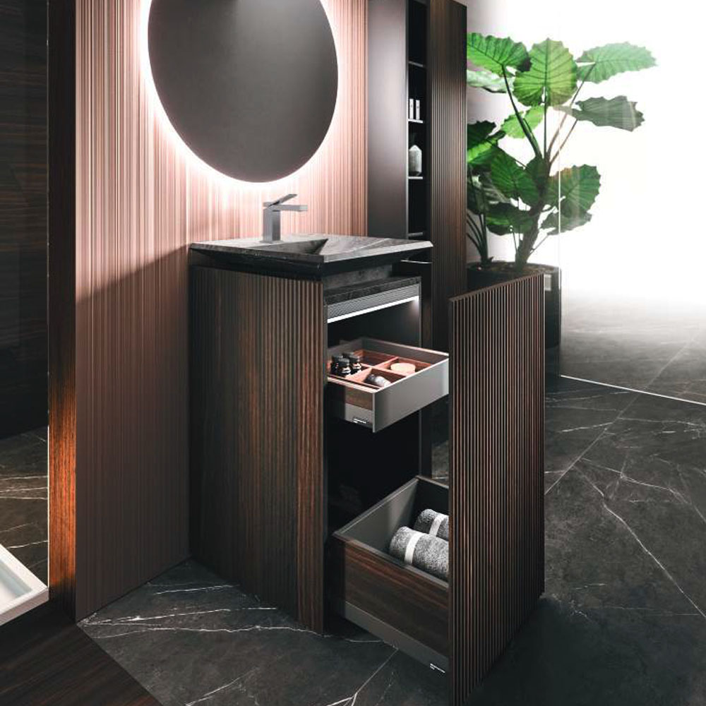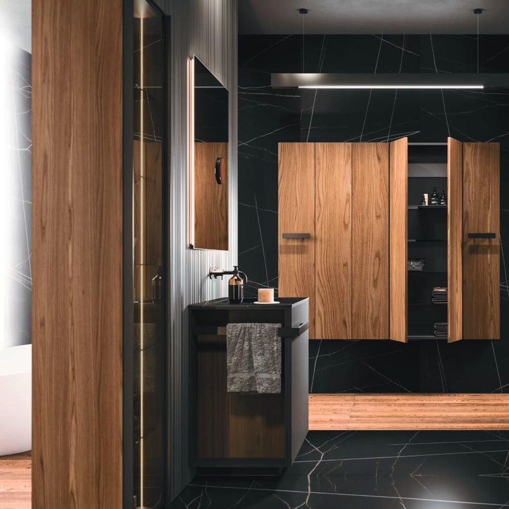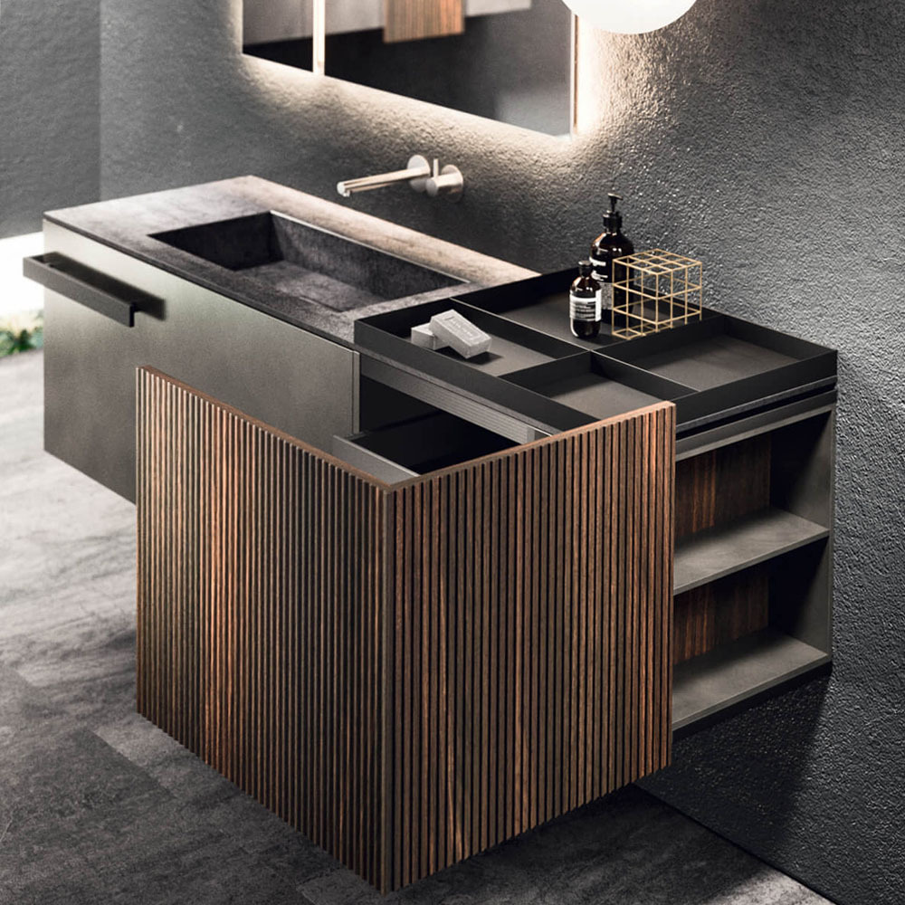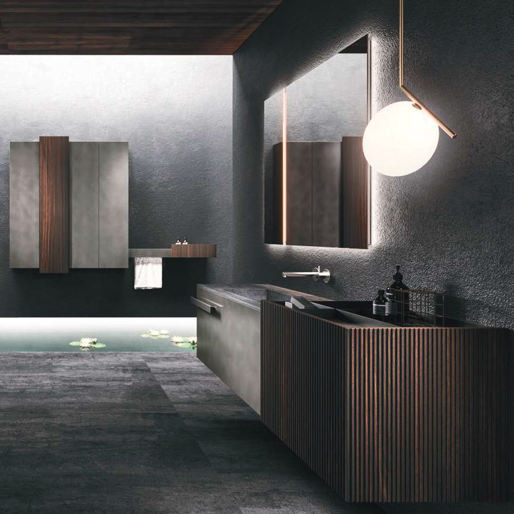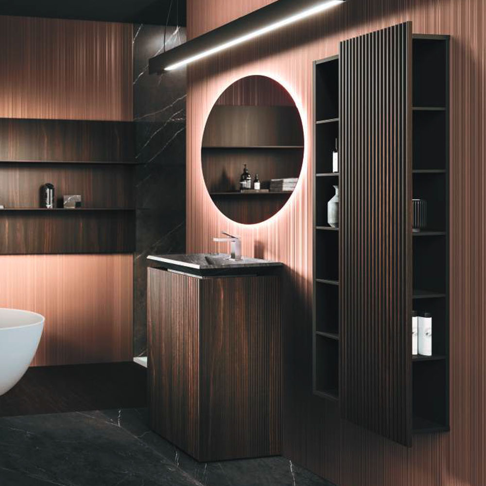 LYMPHA is a complete bathroom furniture set that stands out for its stylish lines and advanced search for prestigious materials. Formal, exclusive details coordinated with the bathroom set finishes; practical and beautiful elements that define the Lympha design. Every single element, from the accessories to the furnishings, to the lighting, has been designed to interpret the bathroom environment as an oasis of well-being. Lympha is a high-design product created to meet the demands of a continuously changing market, where the bathroom environment is increasingly associated with personal care and well-being. The advanced search for prestigious materials is expressed in the broad range of proposed finishes. The Lymph solutions are dressed in elegant gloss, sand, and oxidized lacquers, soft Fenix NTM®, and precious woods, including in particular Rovere Terra Dogato with 3D workmanship featuring thin, corrugated, vertical slats.