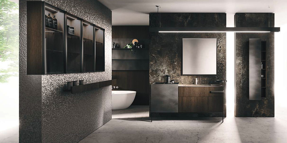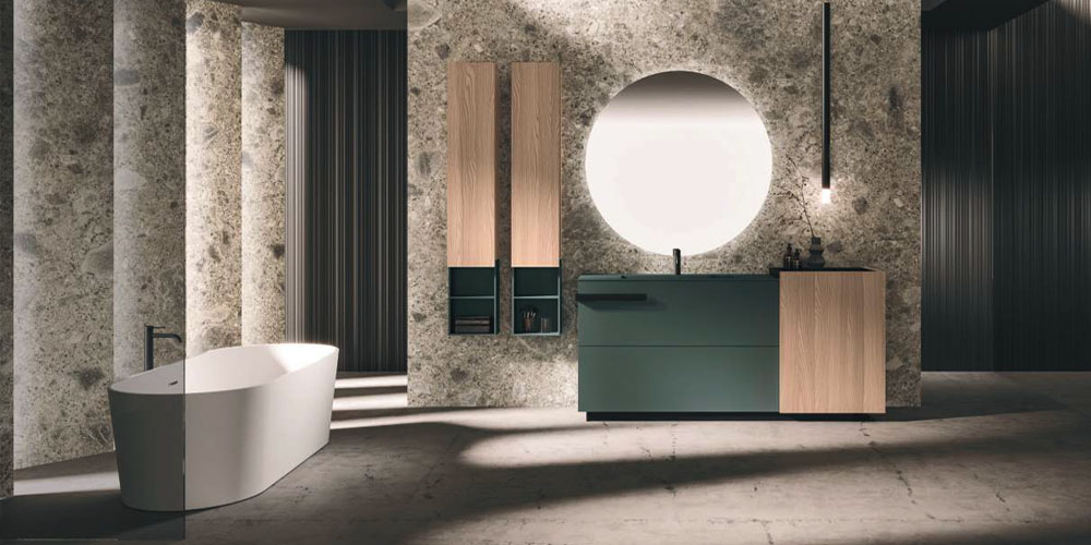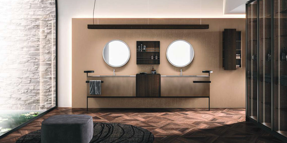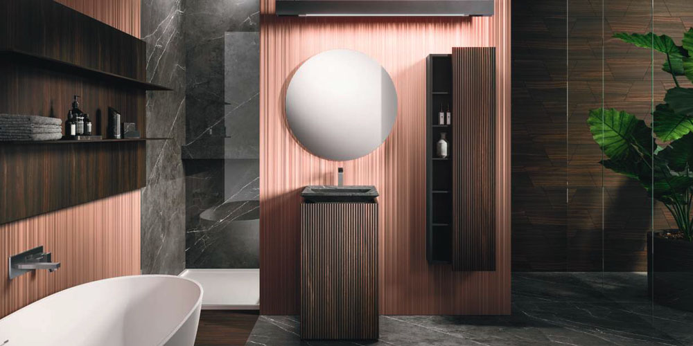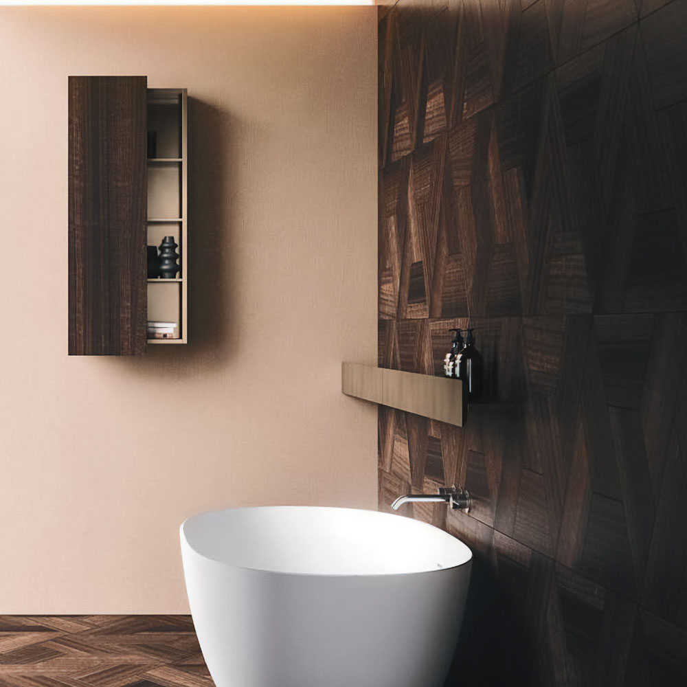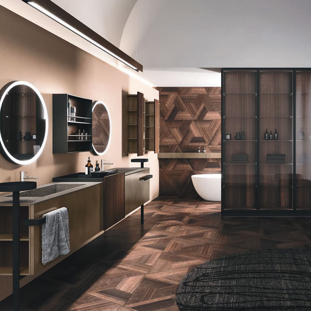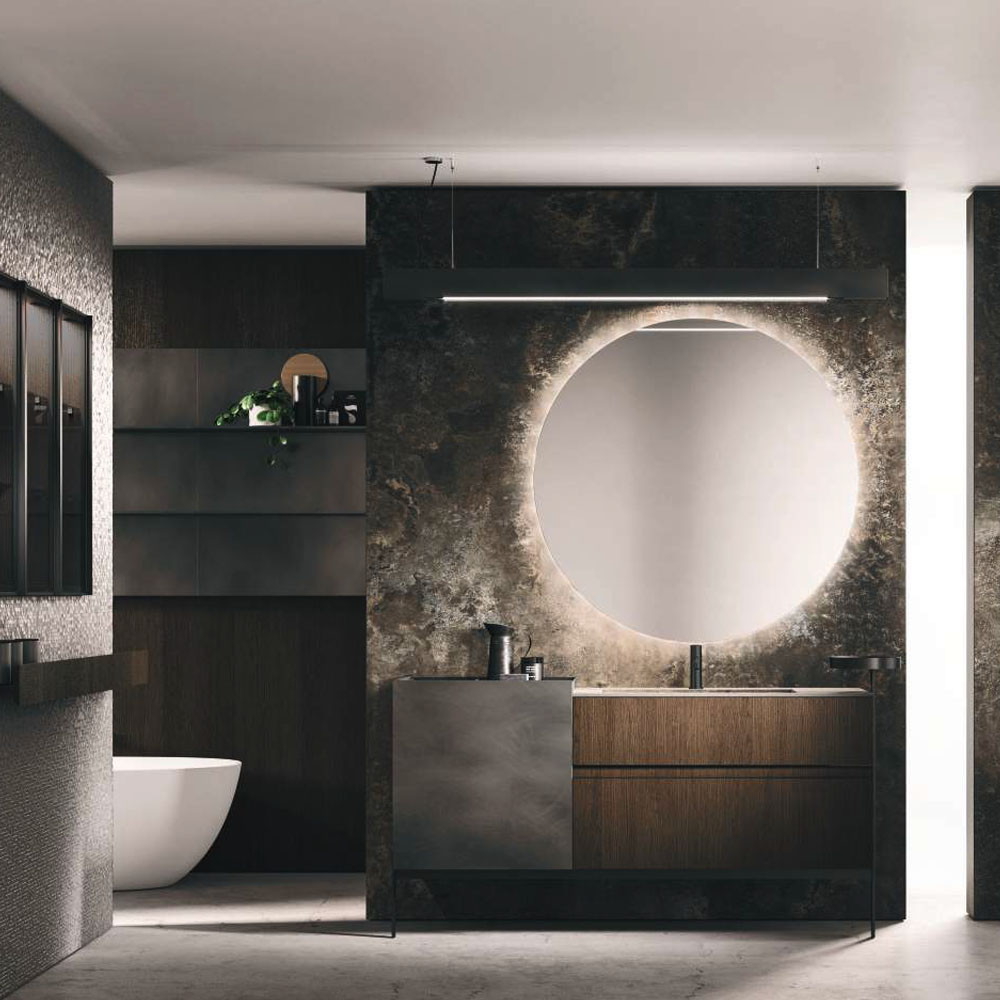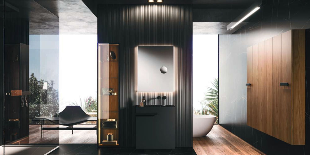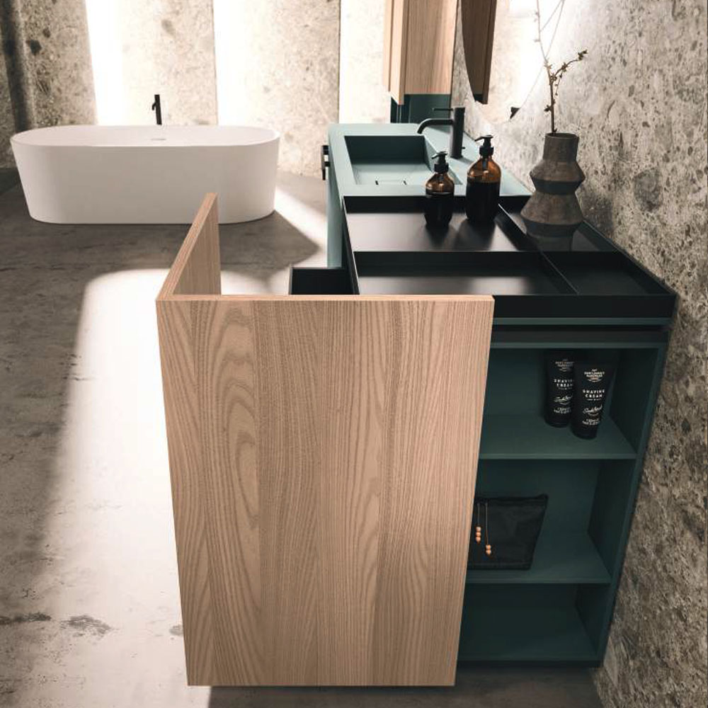LYMPHA is a complete bathroom furniture set that stands out for its stylish lines and advanced search for prestigious materials. Formal, exclusive details coordinated with the bathroom set finishes; practical and beautiful elements that define the Lympha design. Every single element, from the accessories to the furnishings, to the lighting, has been designed to interpret the bathroom environment as an oasis of well-being. Lympha is a high-design product created to meet the demands of a continuously changing market, where the bathroom environment is increasingly associated with personal care and well-being. The advanced search for prestigious materials is expressed in the broad range of proposed finishes. The Lymph solutions are dressed in elegant gloss, sand, and oxidized lacquers, soft Fenix NTM®, and precious woods, including in particular Rovere Terra Dogato with 3D workmanship featuring thin, corrugated, vertical slats.
