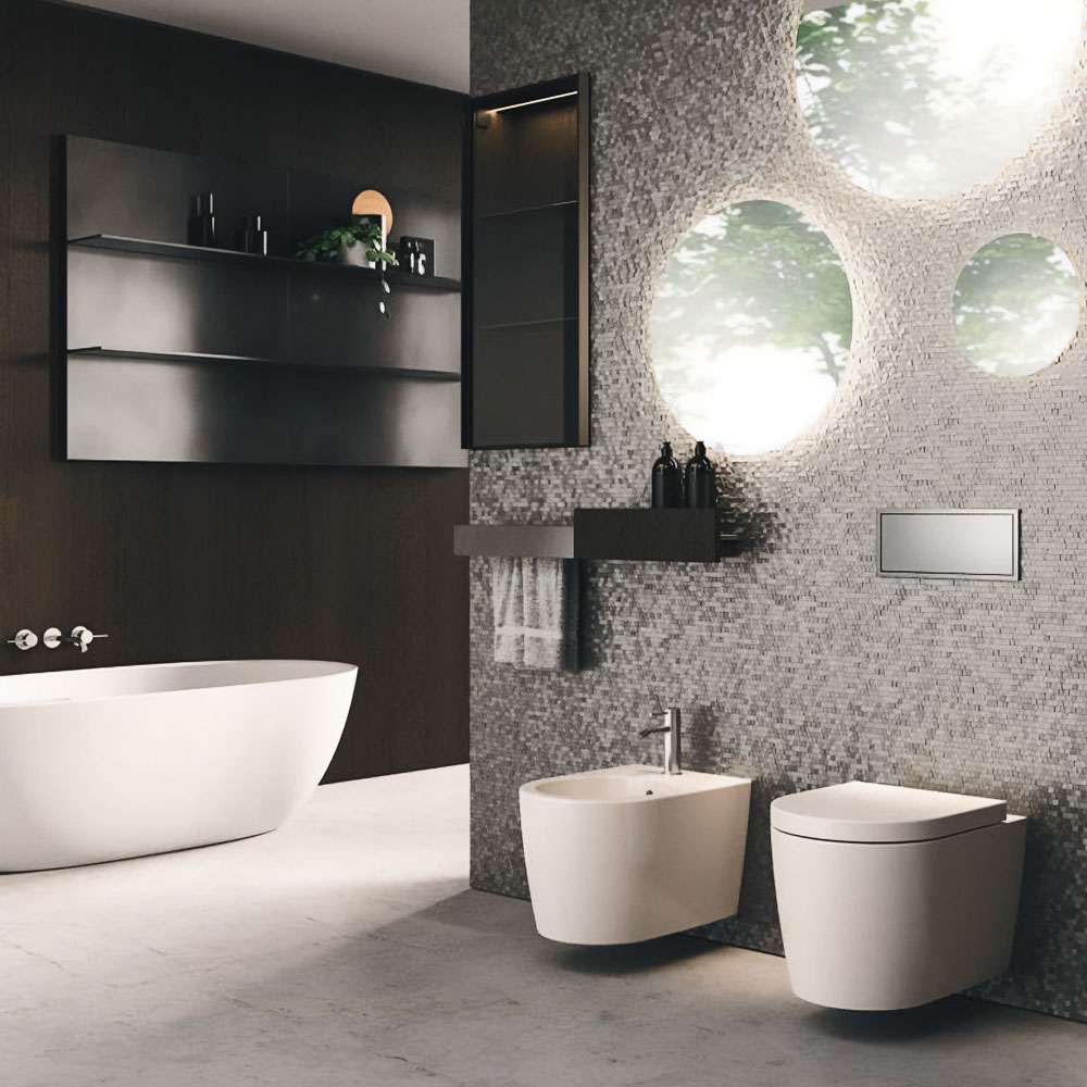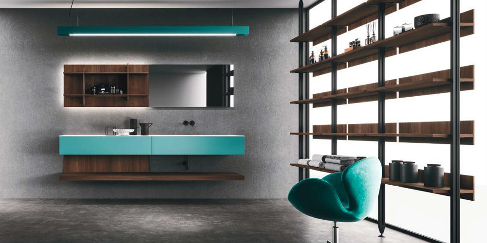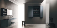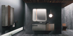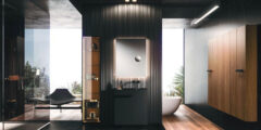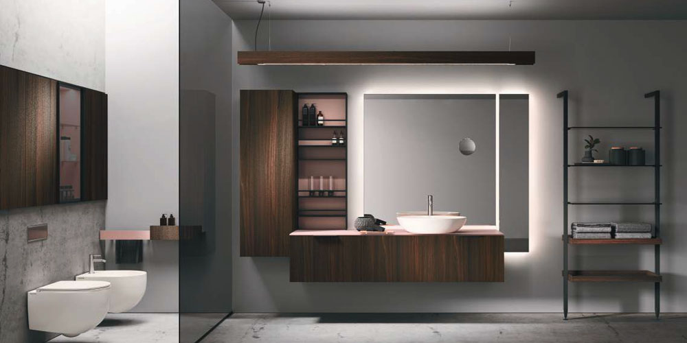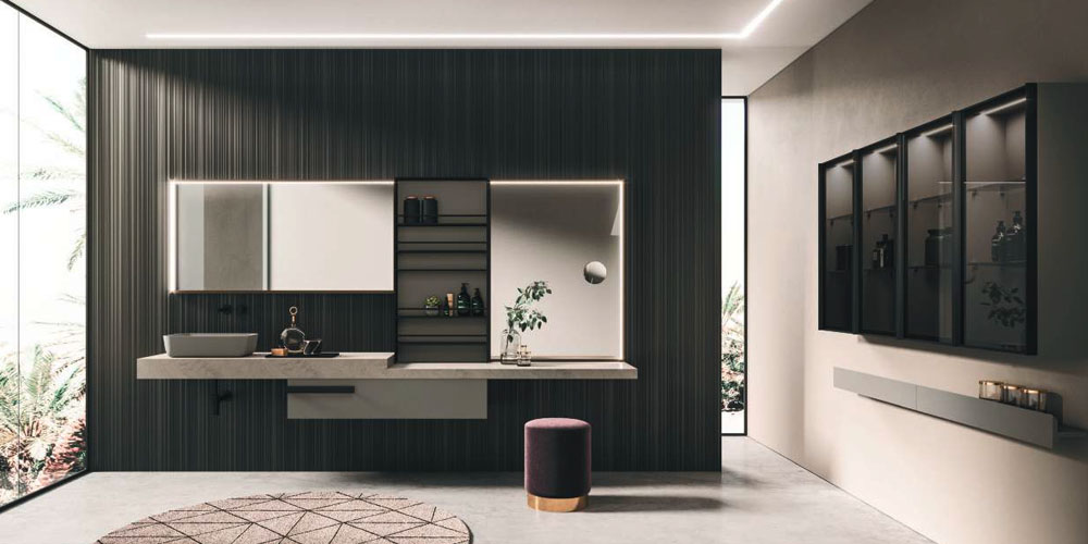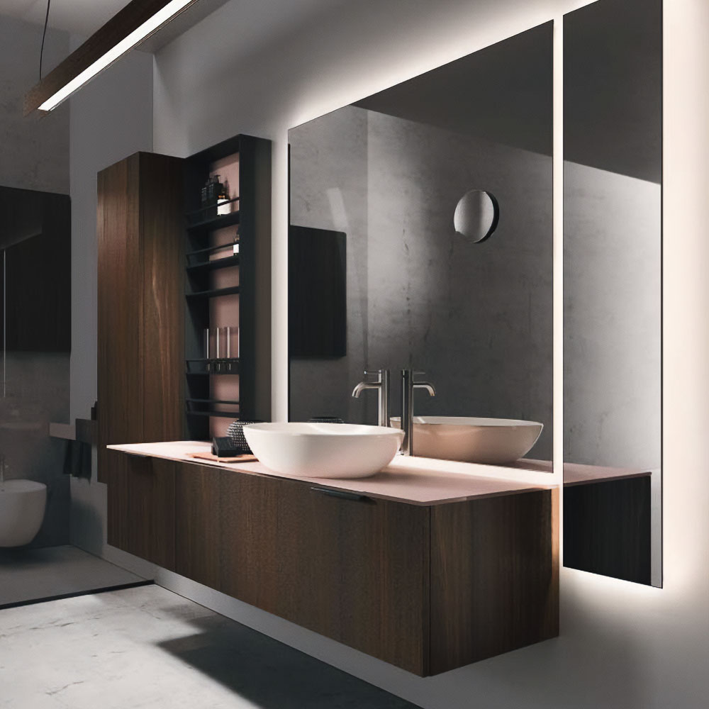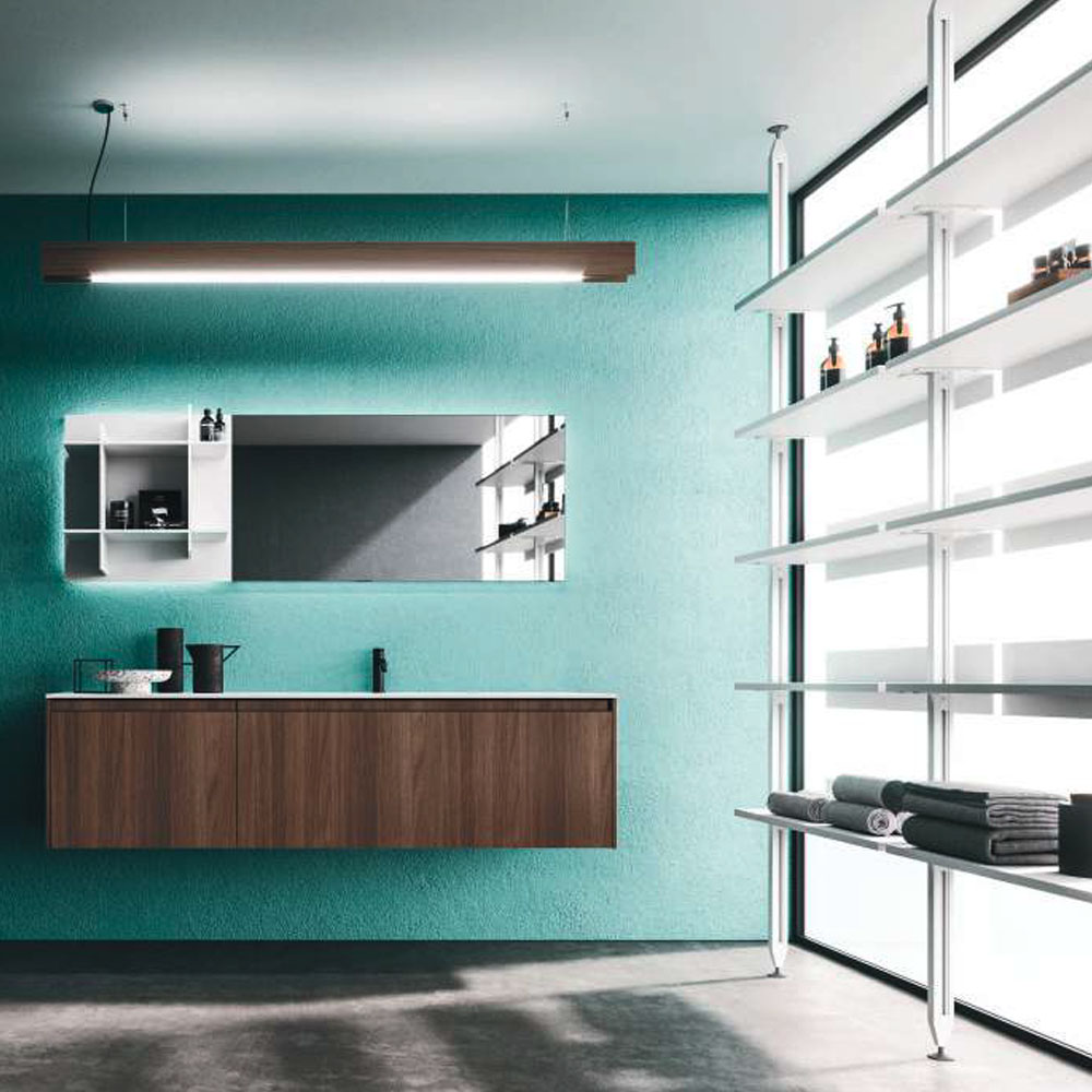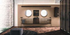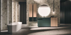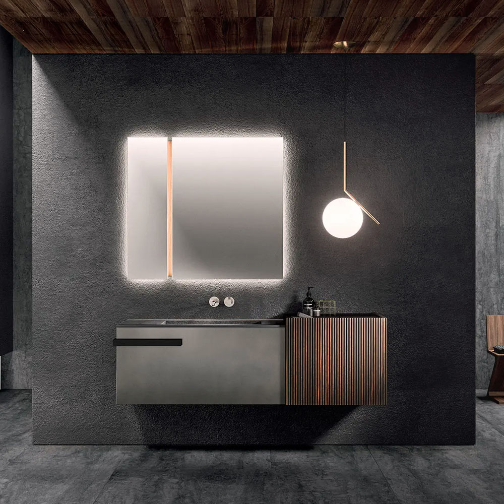 The Lympha pendant light with double-emission LED lighting is available in different sizes and can be personalized in all the proposed finishes. The lighting incorporated into the mirror frame, and internal LED lighting of the furniture units enhances the collection’s practicality.