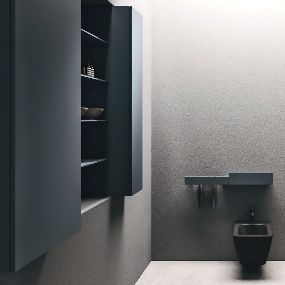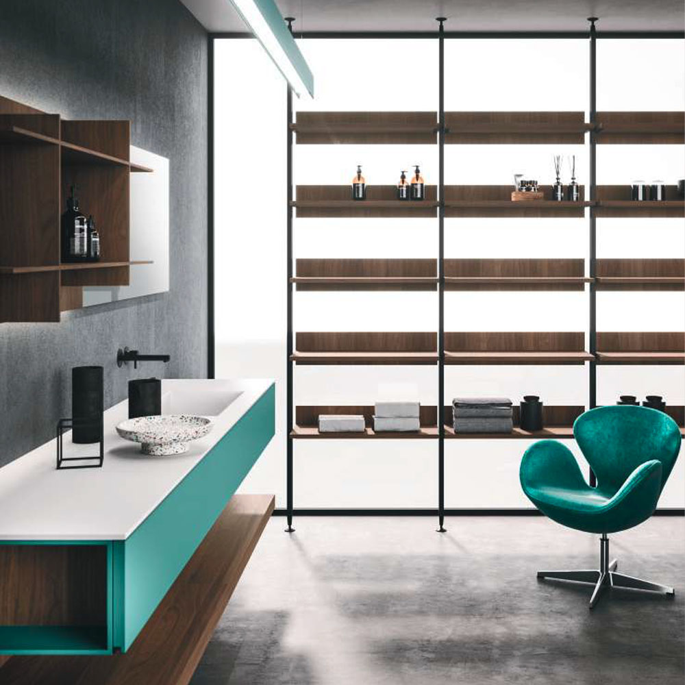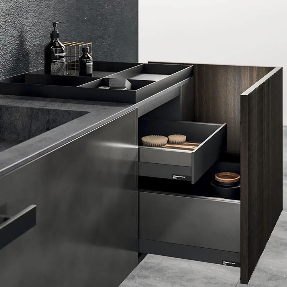 High-design, practical, and elegant accessories enrich the bathroom environment. Lympha proposes a broad range of internal accessories and elements coordinated with the collection, such as the swivel tray connected to the base in painted metal, and opening systems with customizable handles and integrated profiles.