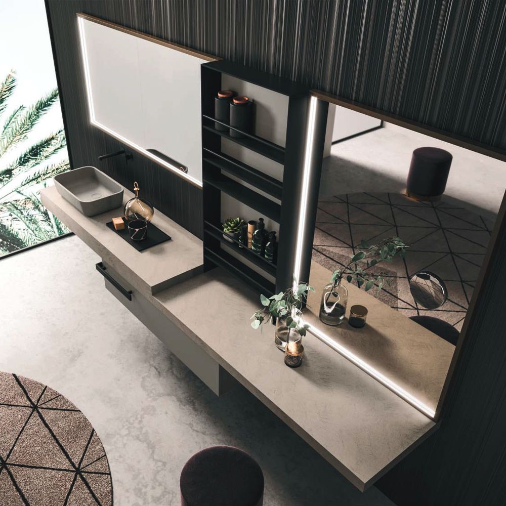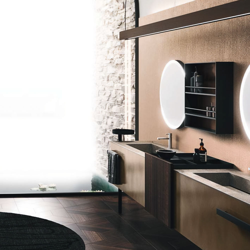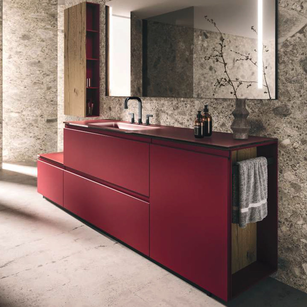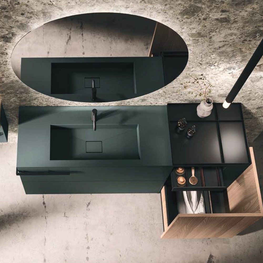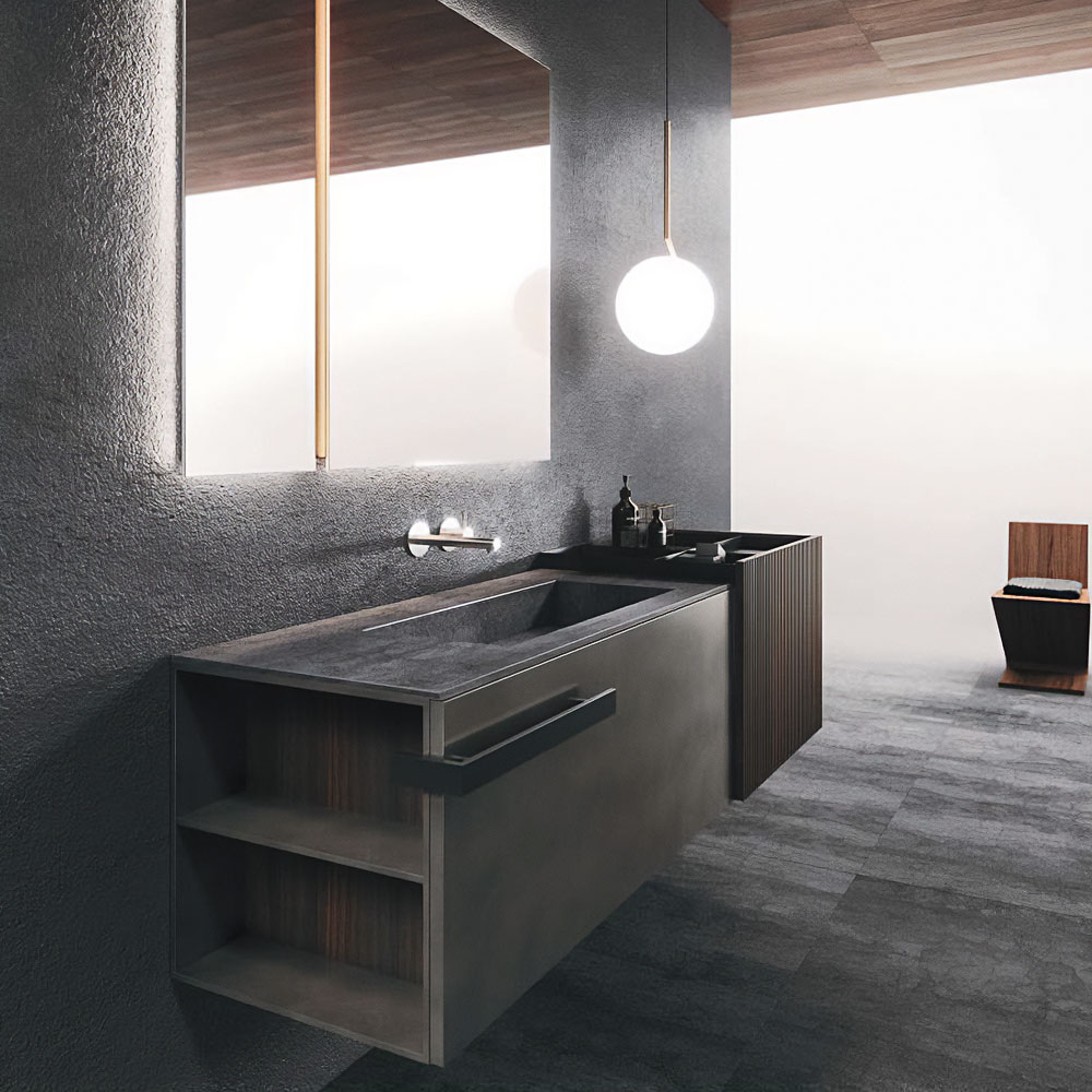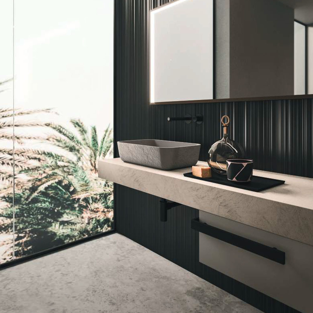 The texture of porcelain stoneware, the soft opaqueness of Fenix, the shine of the lacquers, the Corian®, marbles, metals, glass, and other sophisticated materials dress the vanity tops with or without integrated basin