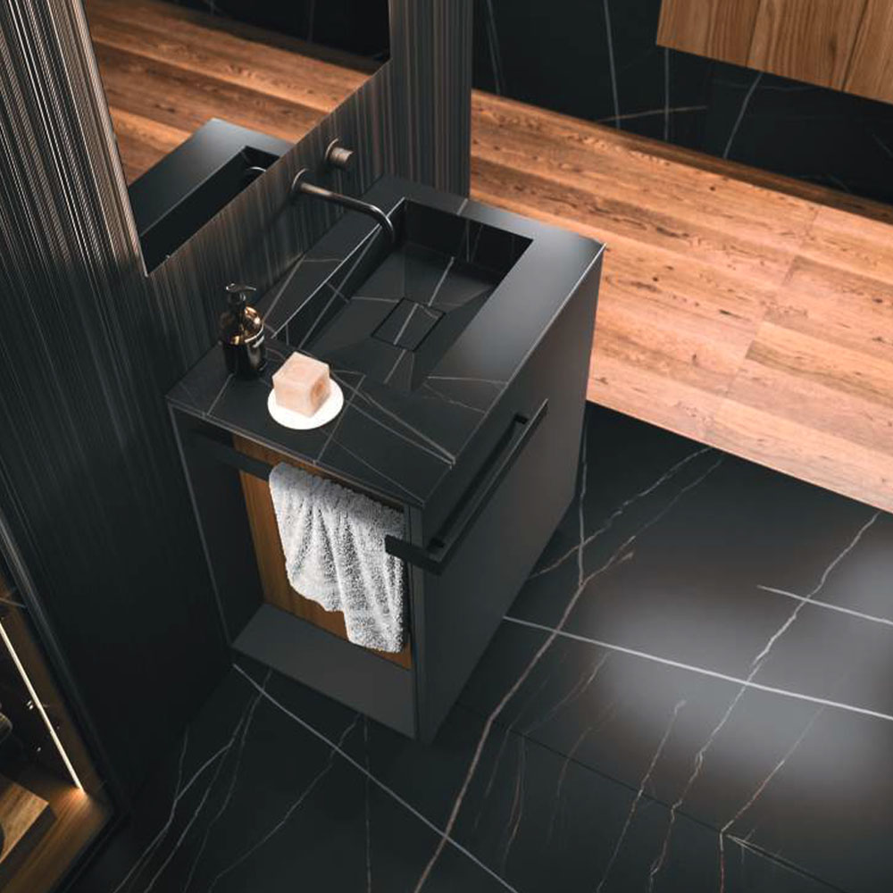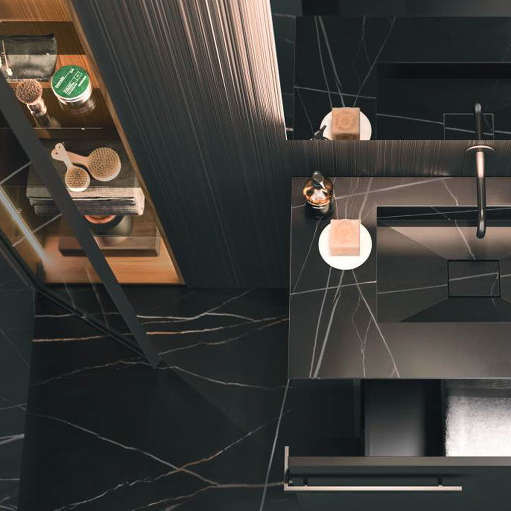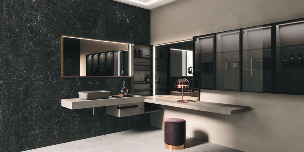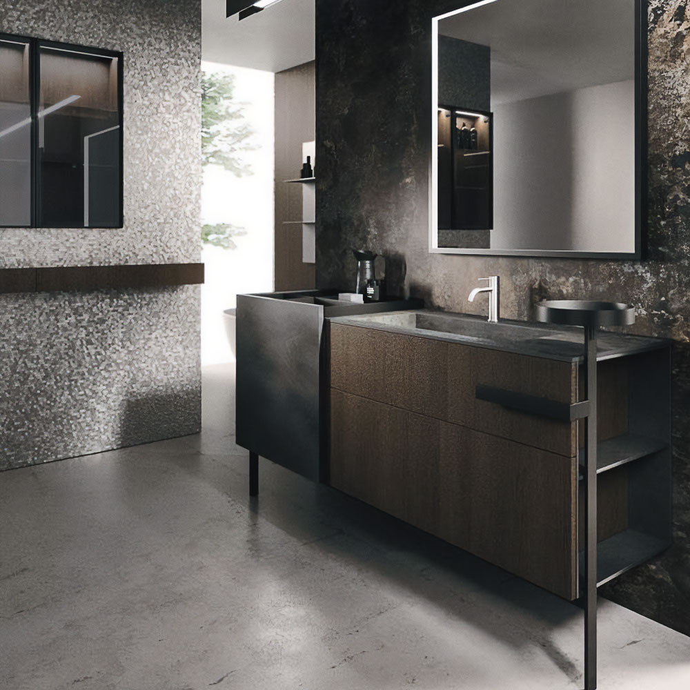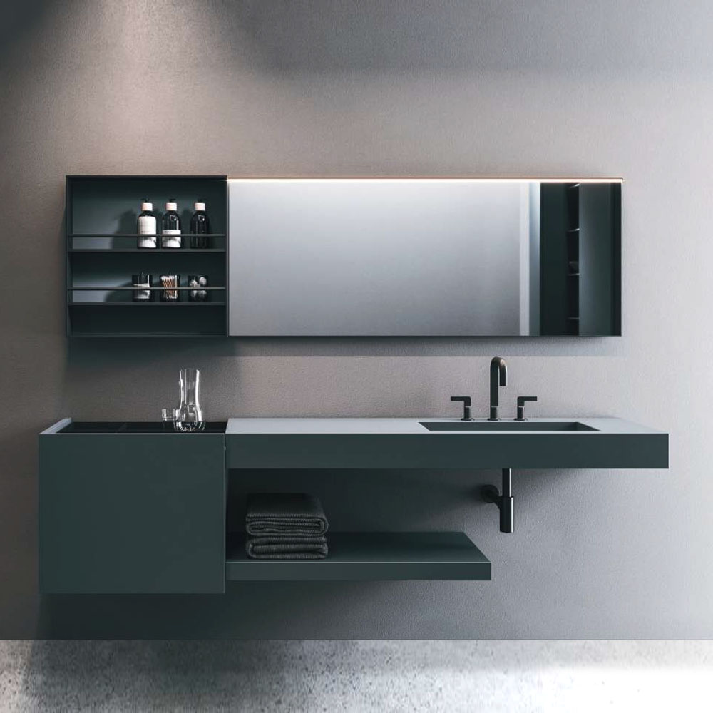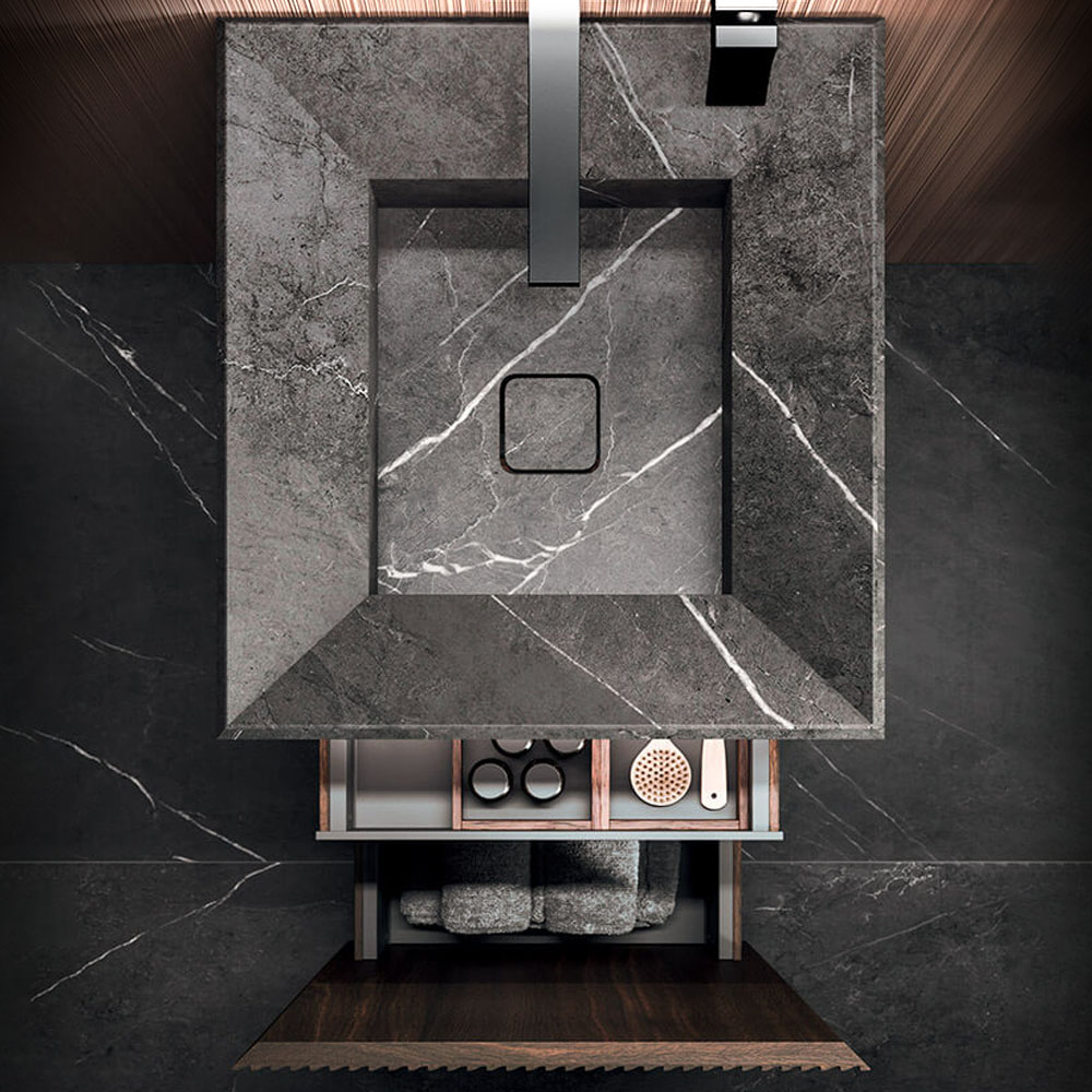 The texture of porcelain stoneware, the soft opaqueness of Fenix, the shine of the lacquers, the Corian®, marbles, metals, glass, and other sophisticated materials dress the vanity tops with or without integrated basin