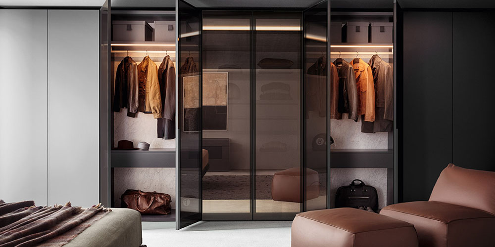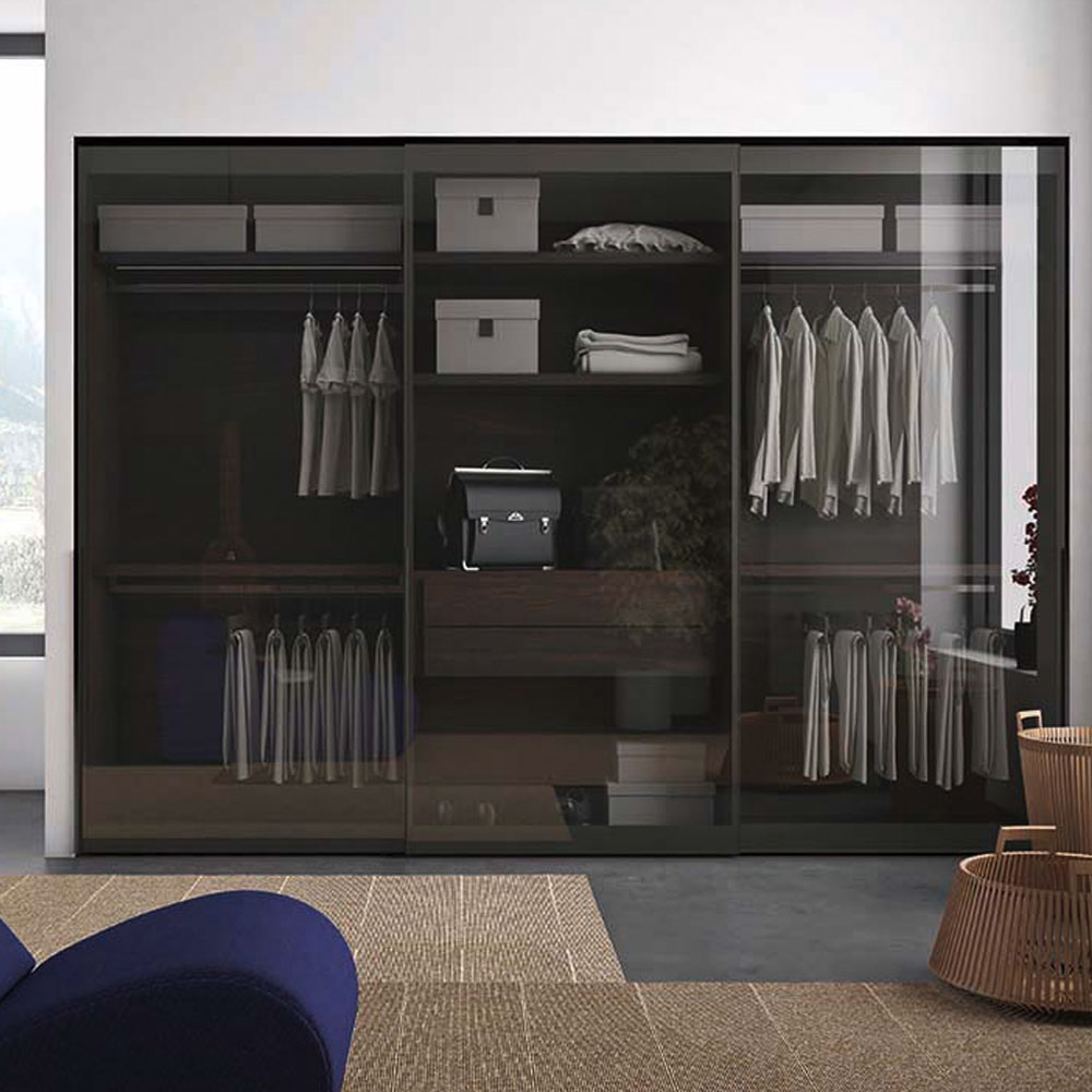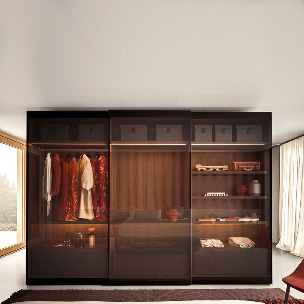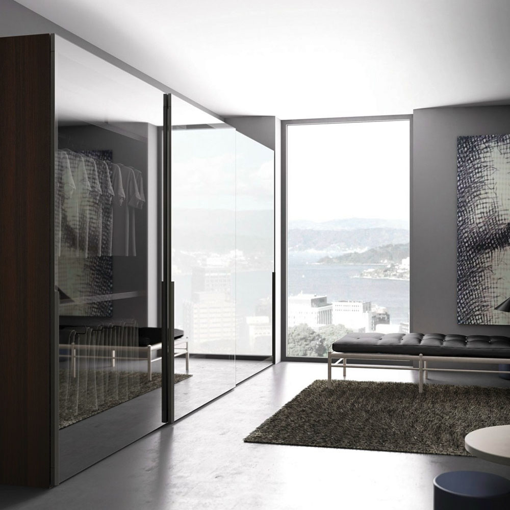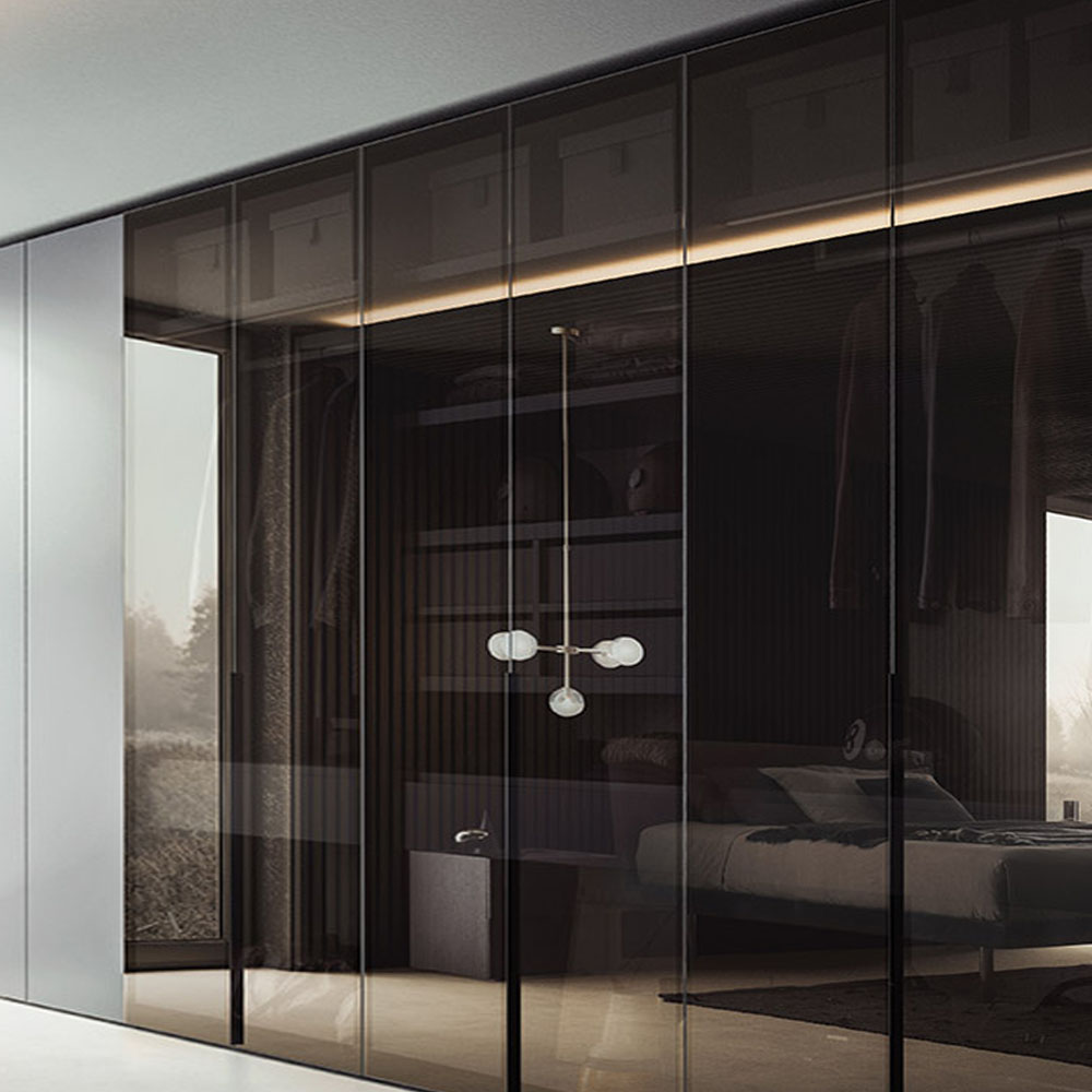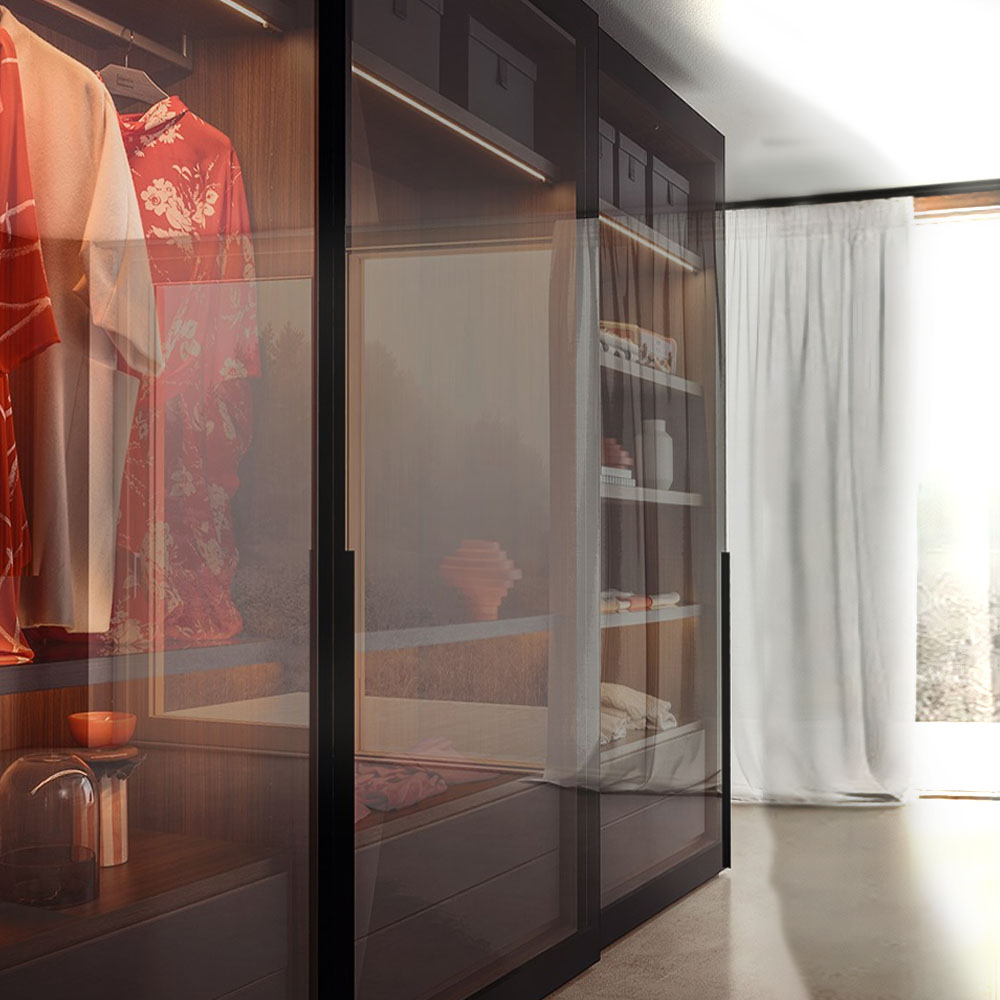 Glass reveals, reflects and mingles the inside with the outside in the most fascinating of ways. The mediator of this dialogue is the glass door panel, in Extra clear Transparent, Transparent or Satin Fumé and Stop Sol finishes and in the three colors available for Trama screen-printed glass: different aesthetic features for varying degrees of transparency. The door sports an intriguing, black, screen-printed frame. The long, slim, inclined handle is made from black anodized aluminum matching the frame and is discreet and handy on both hinged and sliding doors.