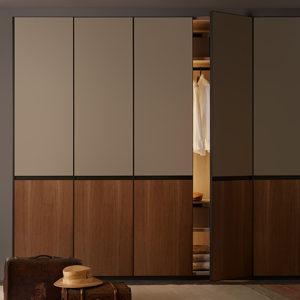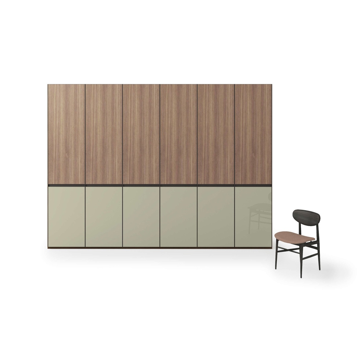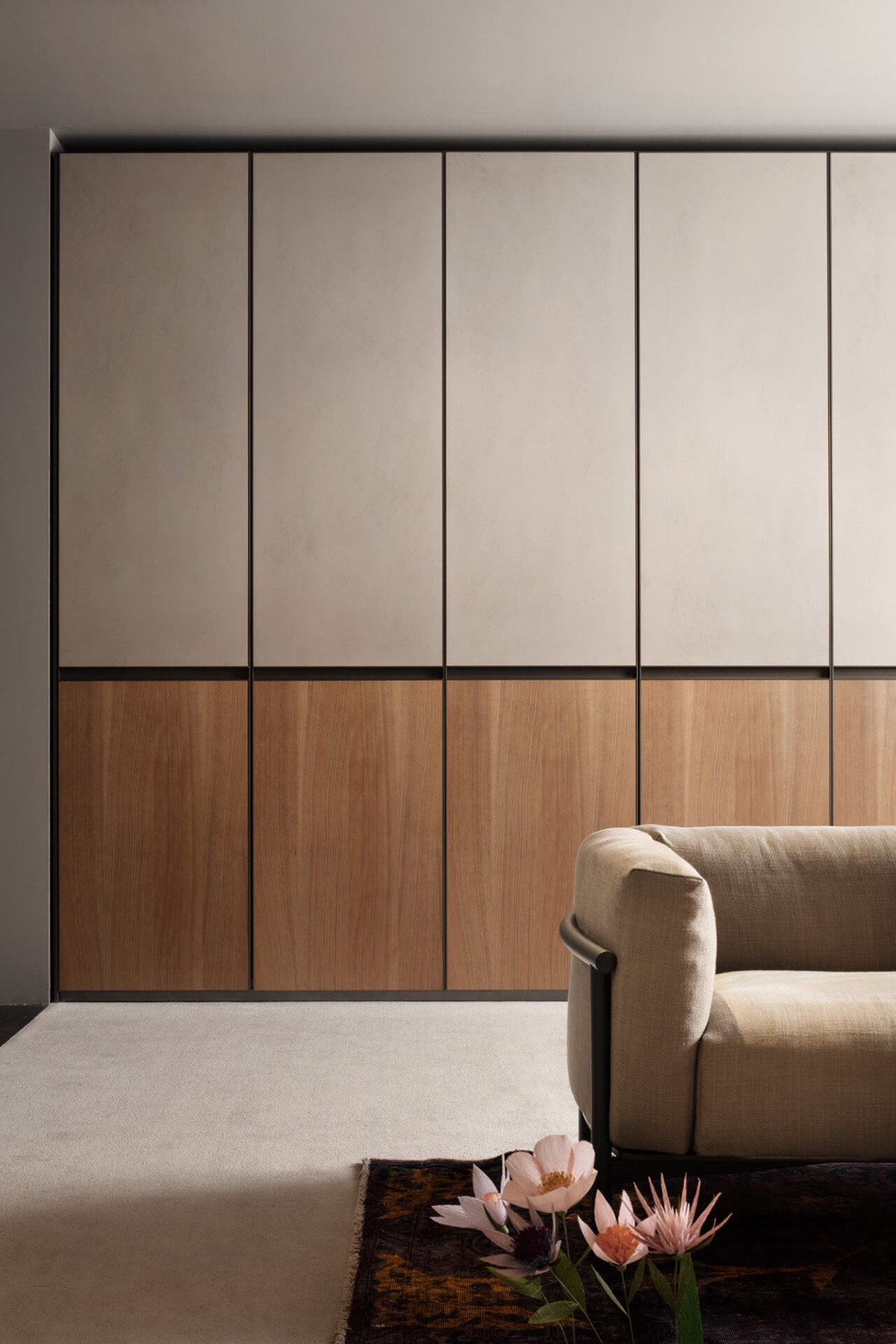 A wardrobe that celebrates the meeting point of different materials, making material and chromatic diversity its strong point. Lena is designed by Piero Lissoni, it is a wardrobe with highly decorative doors that reveals its bold character in the combination of different finishes. The handle disappears into the architecture, becoming the defining element that marks the boundaries of the various materials. Lena is complete thanks to the extensive catalog of equipment designed to meet multiple specific functional needs such as chests of drawers, trouser racks, belt holders, shoe racks, shelves and bars, coat hangers and an integrated LED light system.