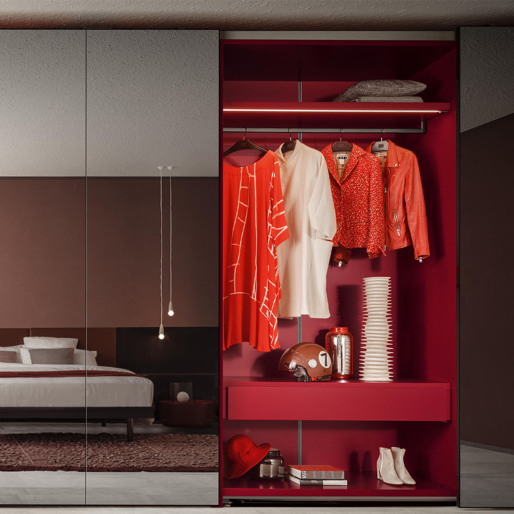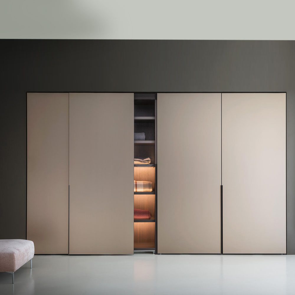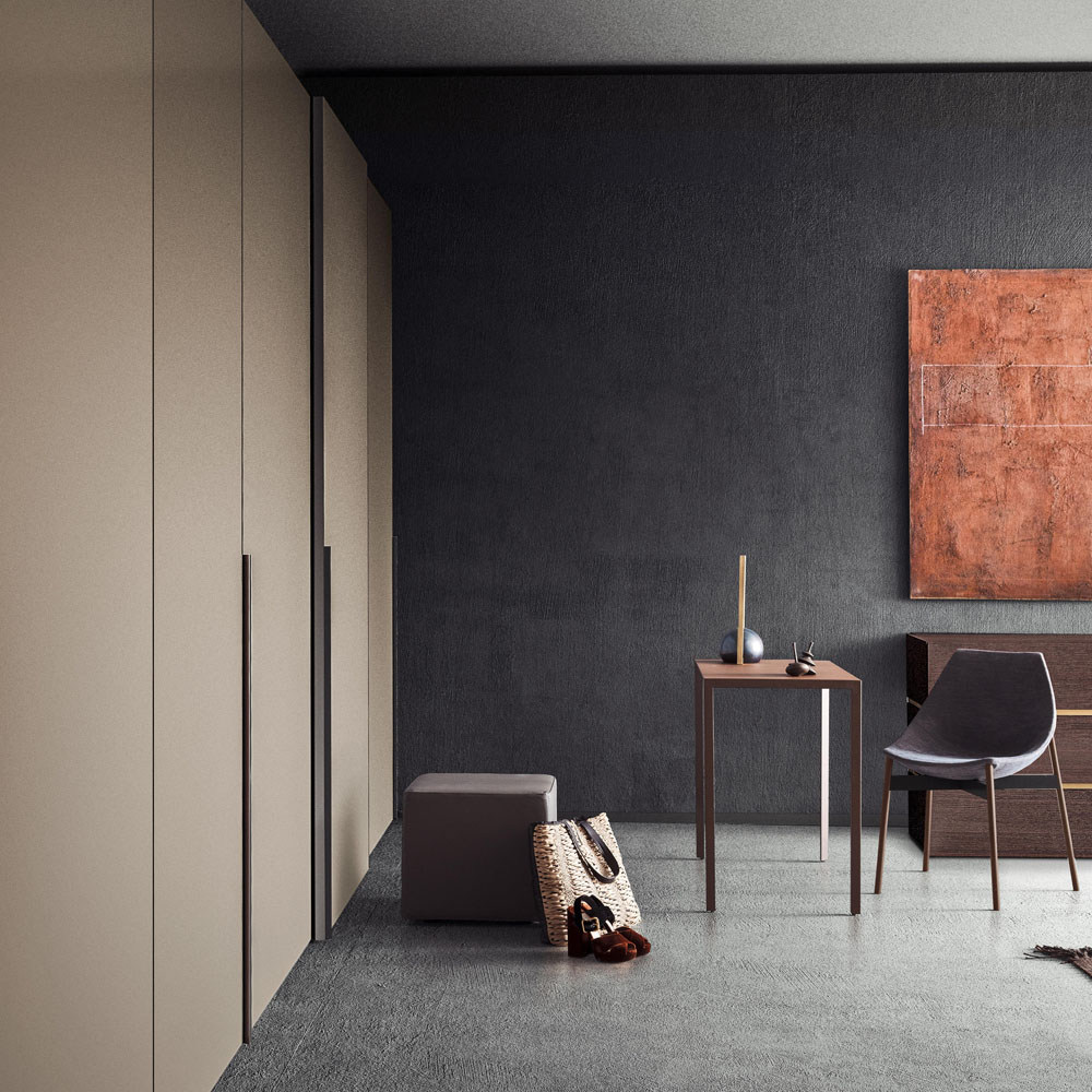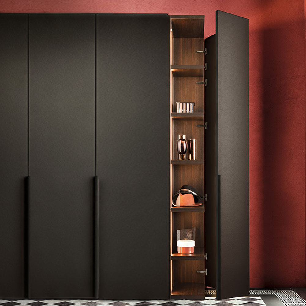 The slim, uninterrupted line of the frame draws a discreet and minimal outline. In lacquered or black anodized aluminum, it punctuates the run of vertical modules or tends to blend in when coordinated with the surface finish of the doors available in lacquered glass, mirror, wood and textured finishes as well as man-made leather and matt or gloss lacquers. Long and slightly angled, the handle is designed to form a line that carries on from the frame, giving the door an elegant, linear appeal and offering an excellent grip to any type of hinged, sliding and flush sliding door.