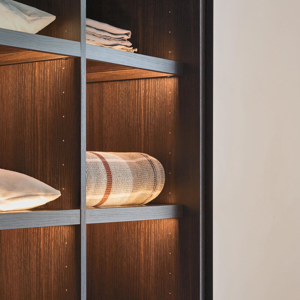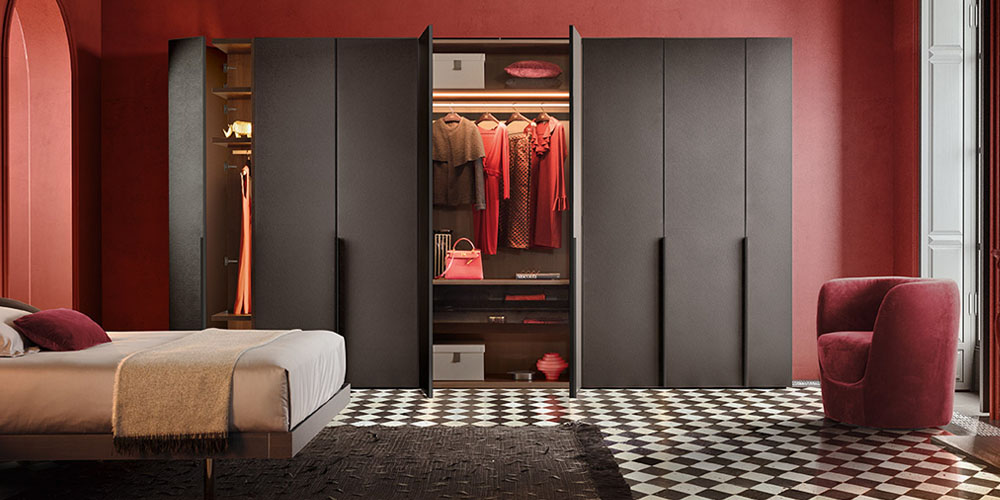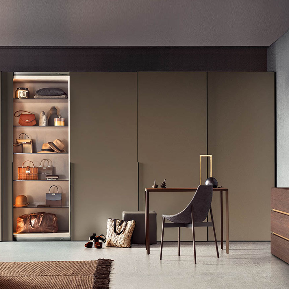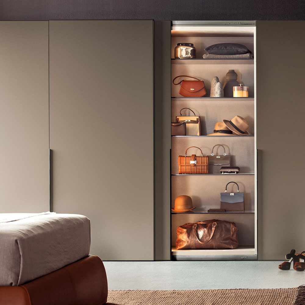 The slim, uninterrupted line of the frame draws a discreet and minimal outline. In lacquered or black anodized aluminum, it punctuates the run of vertical modules or tends to blend in when coordinated with the surface finish of the doors available in lacquered glass, mirror, wood and textured finishes as well as man-made leather and matt or gloss lacquers. Long and slightly angled, the handle is designed to form a line that carries on from the frame, giving the door an elegant, linear appeal and offering an excellent grip to any type of hinged, sliding and flush sliding door.