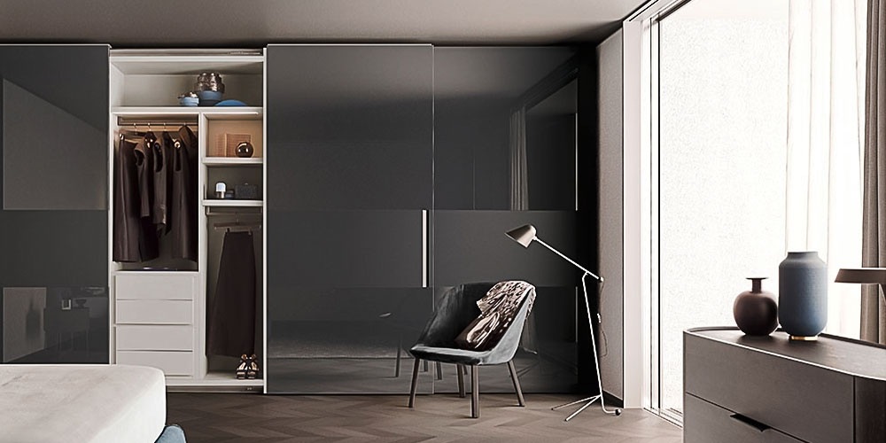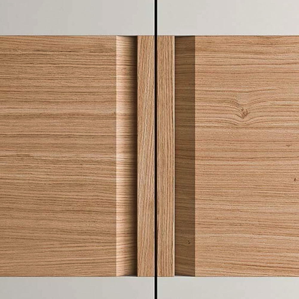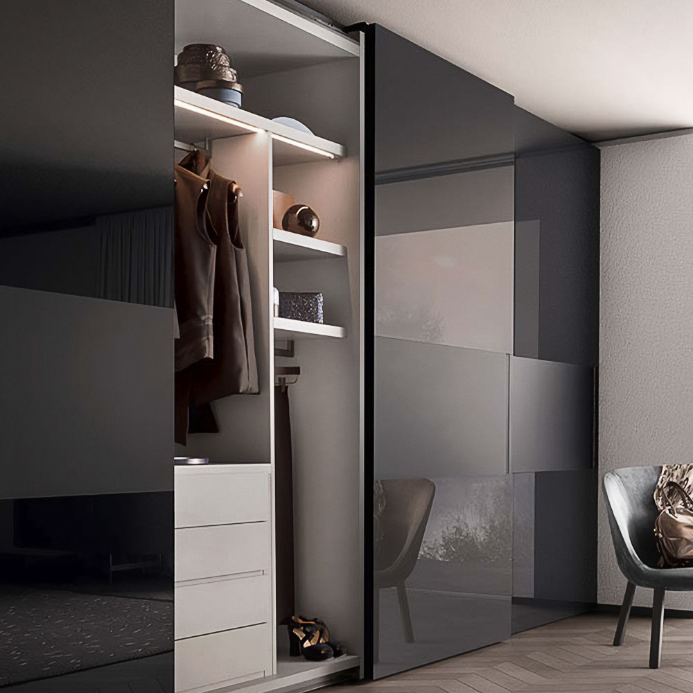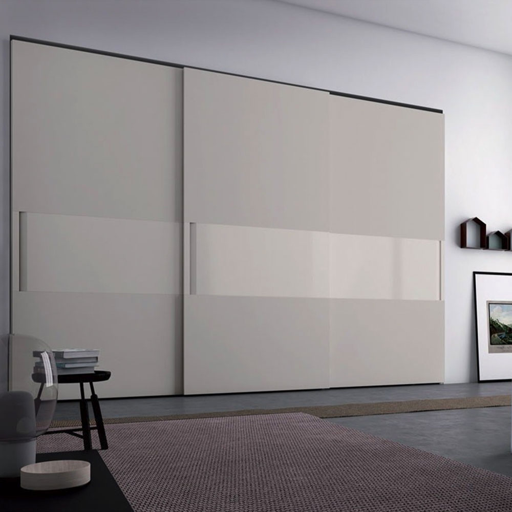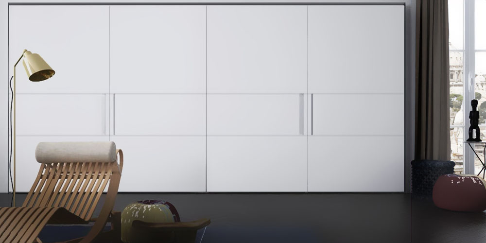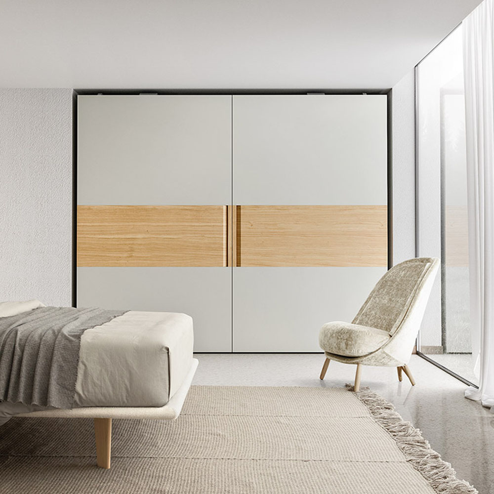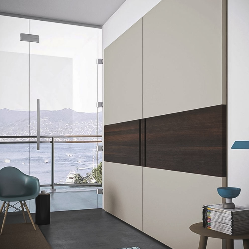 Harmony and elegance are punctuated by contrasting materials. Vela’s design inverts the typical vertical development of the door and suggests new visual effects. The central panels that interrupt the finish of sliding or flush sliding doors create three, horizontal bands. A contrast is achieved by choosing different lacquered or wood finishes for these bands. The vertical handle, carved out of the central panel, is available lacquered or in wood.
