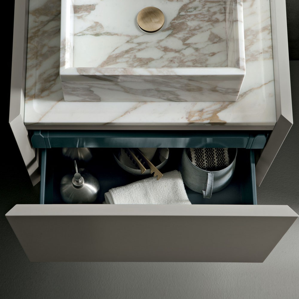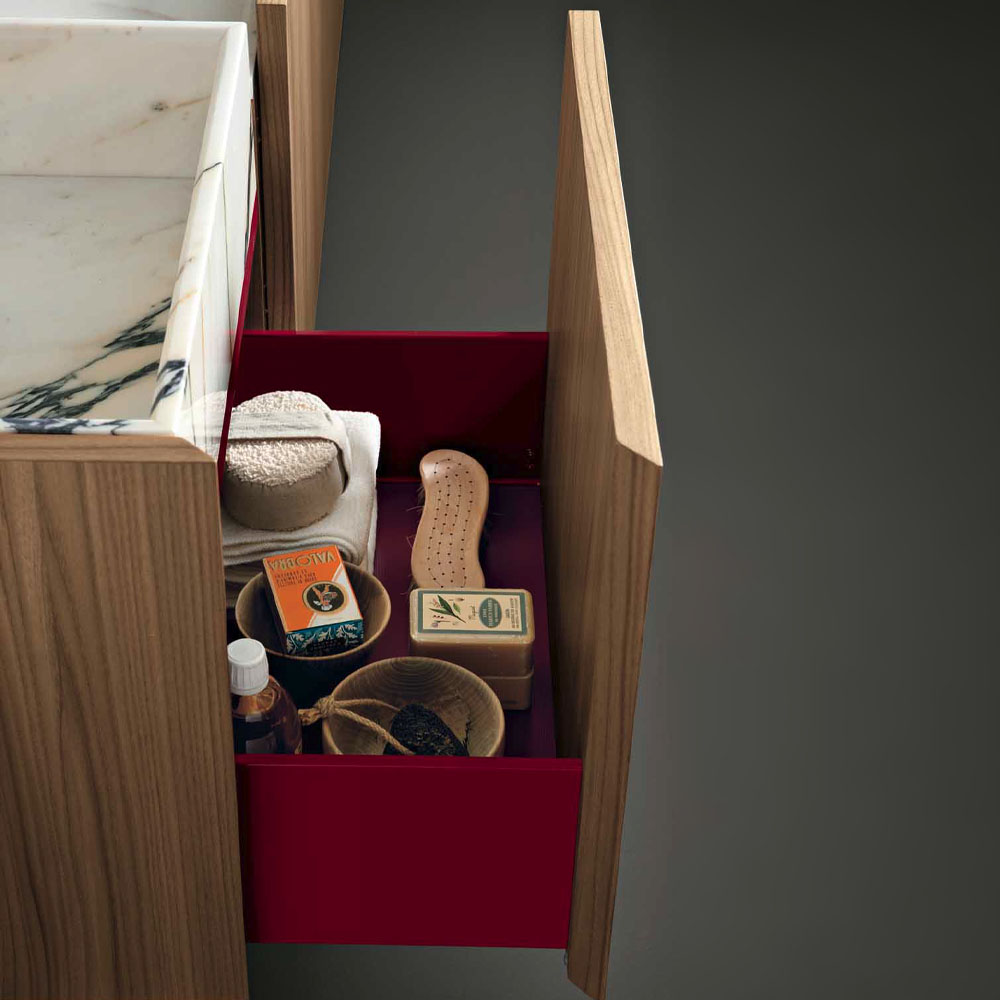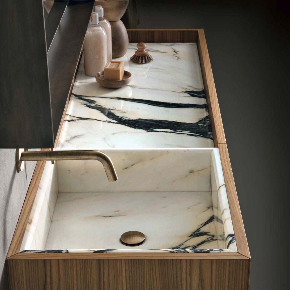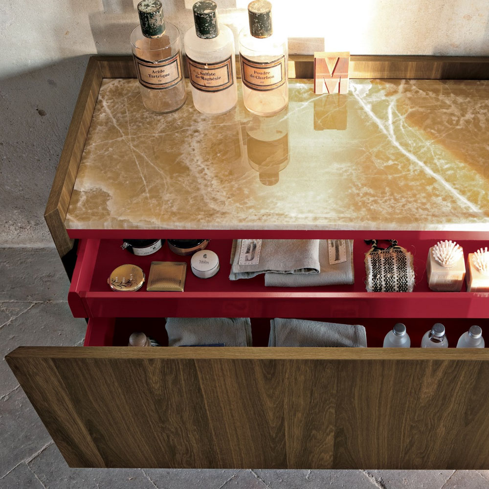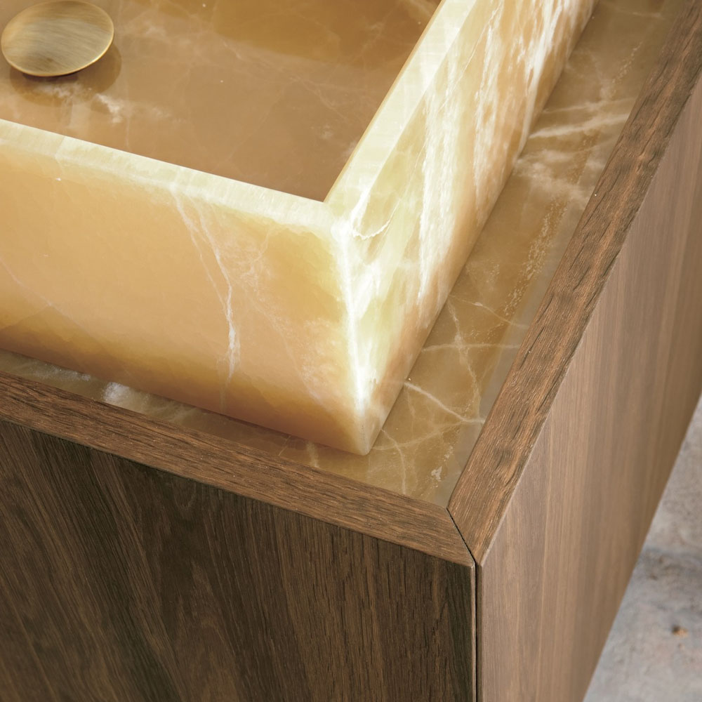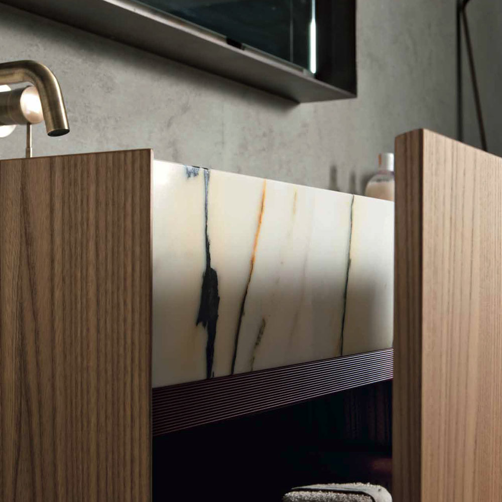 Must is a bathroom furniture set characterized by new and precious materials such as Onice Brown, Marmo Paonazzetto, or Marmo Fior di Pesco Carnico. Precious woods, such as Olmo and Eucalipto Termocotto, and oxidized effect metal finishes are the essence of Must: the juxtaposition with the delicate lines traces out a space that goes beyond time. The smooth details and enveloping sensuality of the materials create a timeless space, where everything is weightless and the delicate lines go hand in hand with unrepeatable emotions. Harmony and carefully studied proportions. The style of a project goes beyond definitions, becoming synonymous with luxury and pleasure. The external surfaces show off a variety of sophisticated finishes: the different shades of the oxidized effect metal finish, the oriental allusions of Onice Brown, and the warmth of the precious wood are juxtaposed with the shine of the lacquers and marbles to create a unique and timeless atmosphere.