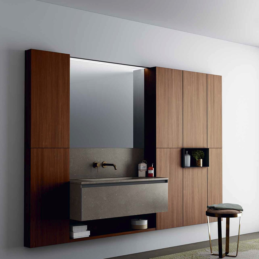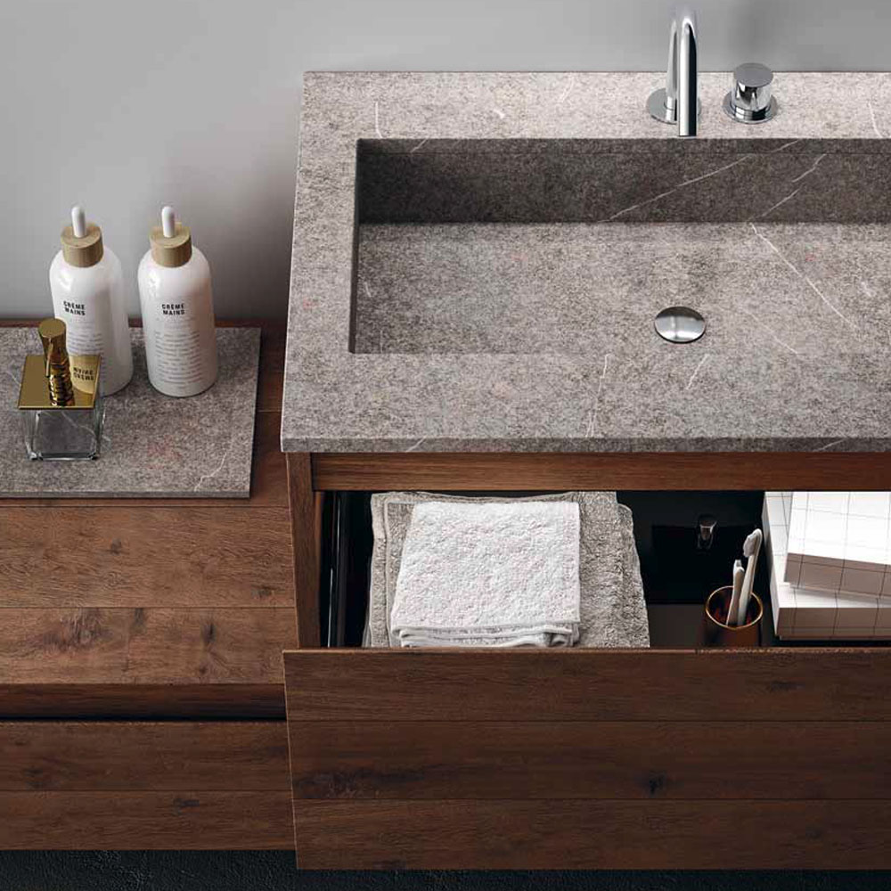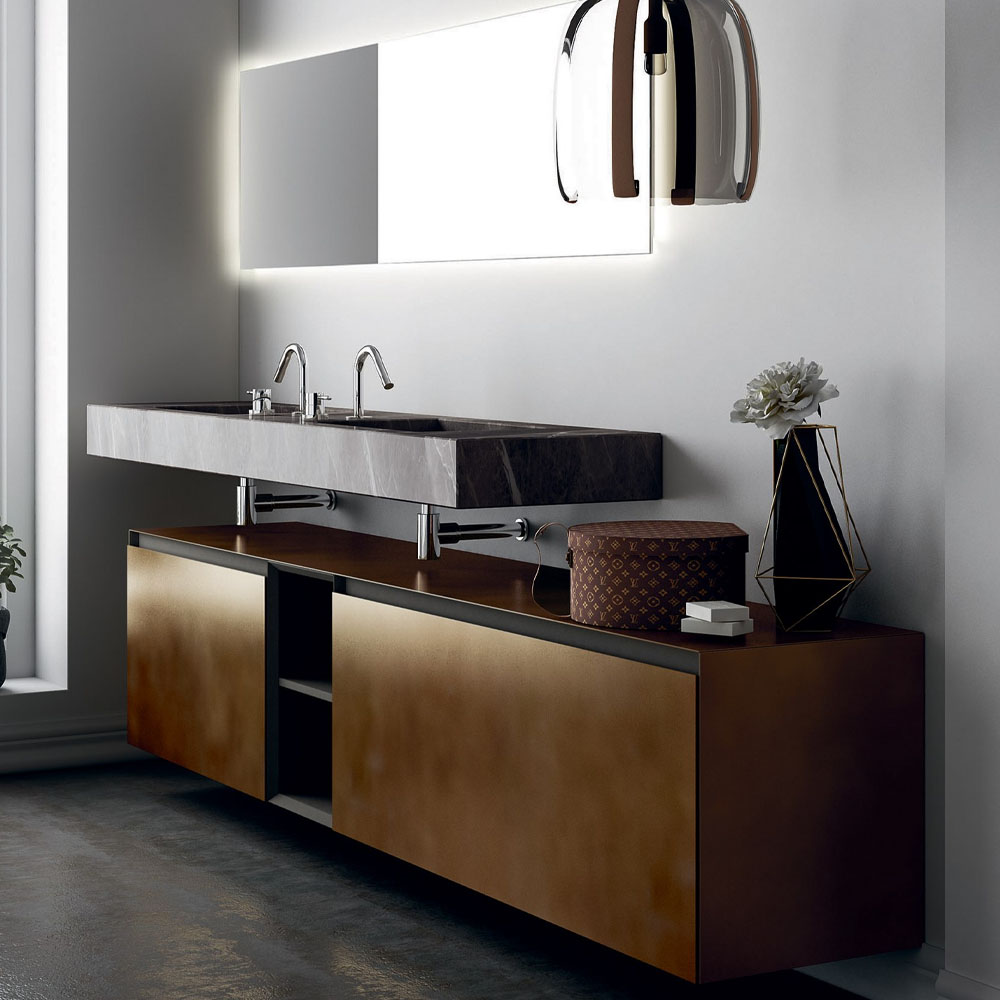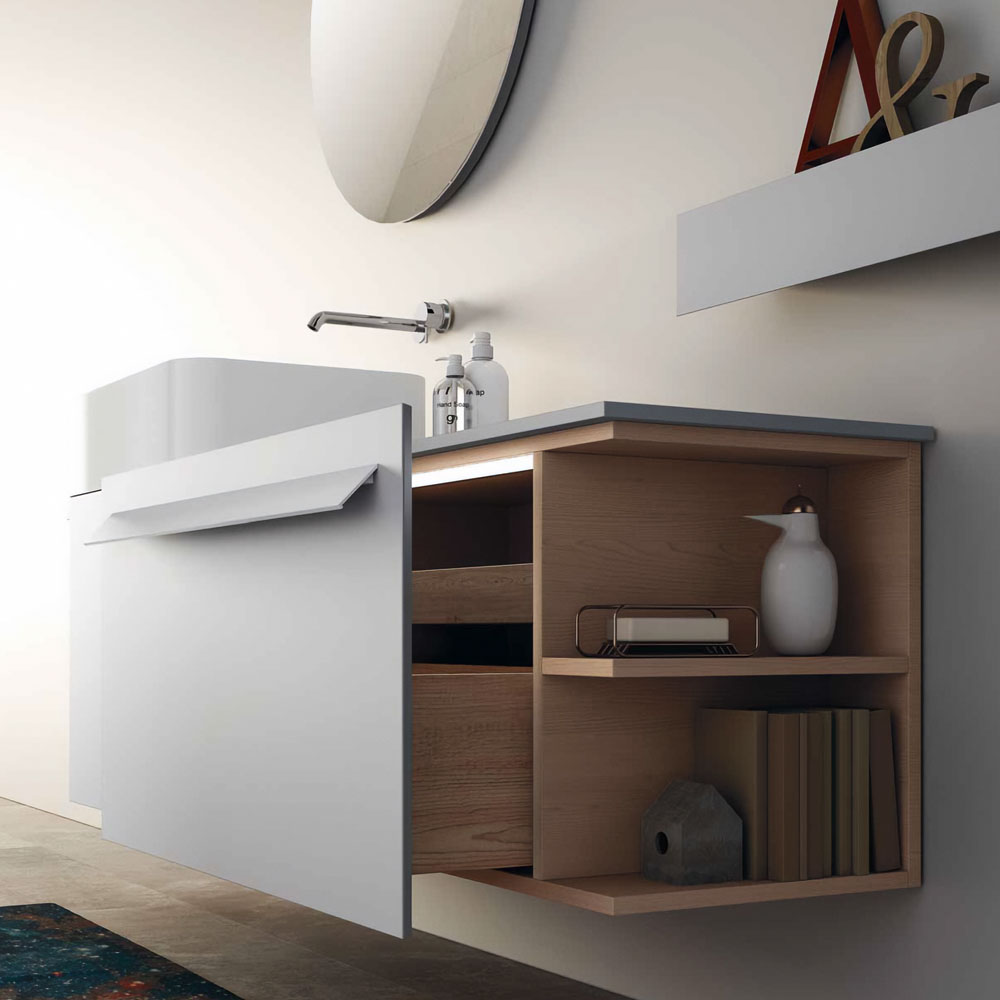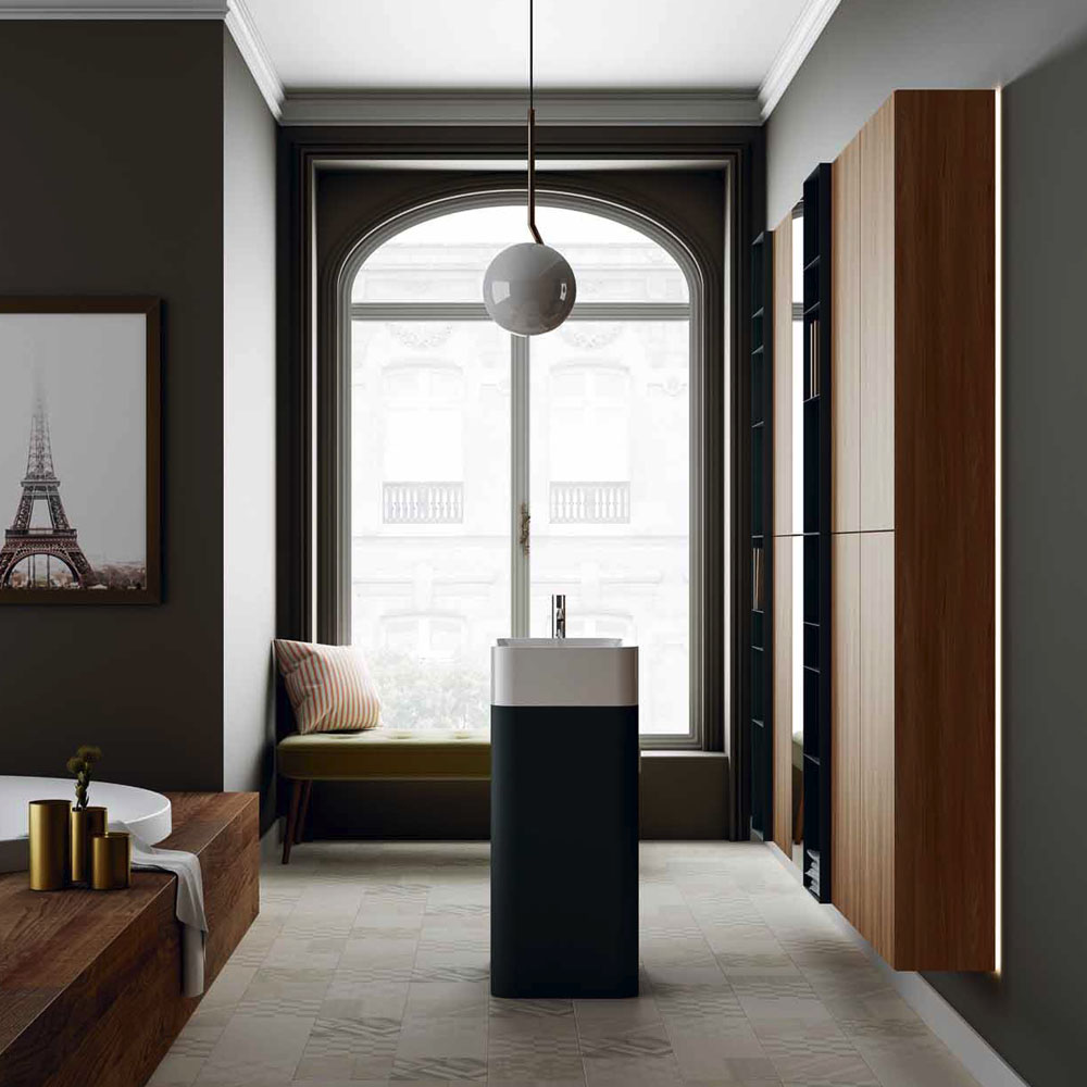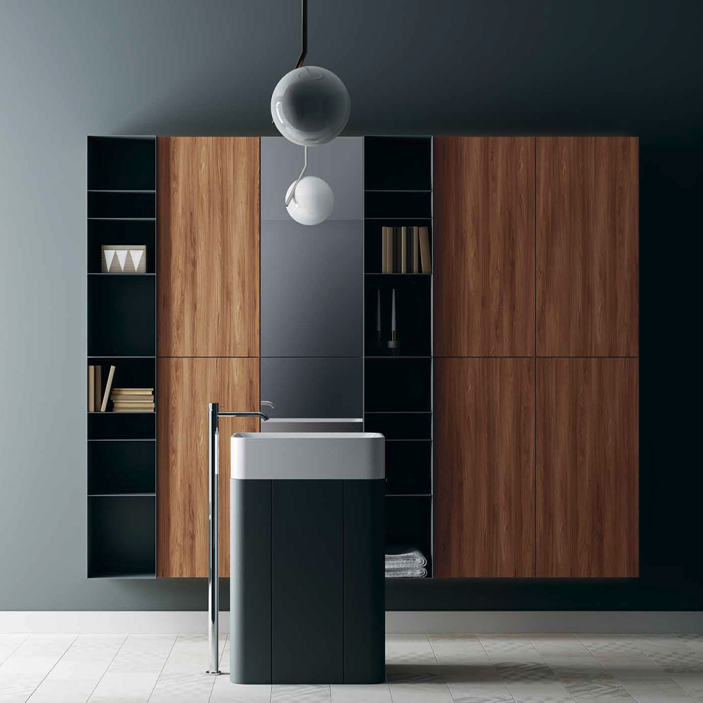 360Gradi is a bathroom furniture set with a markedly contemporary design. A unique collection by way of its distinctive features able to satisfy a range of different styles, and modular structure that easily adapts to a broad variety of materials. Details that convey a style, attentiveness, and thought reserved for analysis. Stories of different experiences and lifestyles. 360Gradi is the opportunity to interpret countless living projects at will. Traditional materials combined on the back of the principle of contemporary elegance. The 360Gradi collection ranges from sand or gloss lacquers to precious woods, all of which can be personalized with door and side finishes in porcelain stoneware, Fenix NTM®, metals, Corian®, lacquered glass, and even the same wood panels as those used for the flooring.