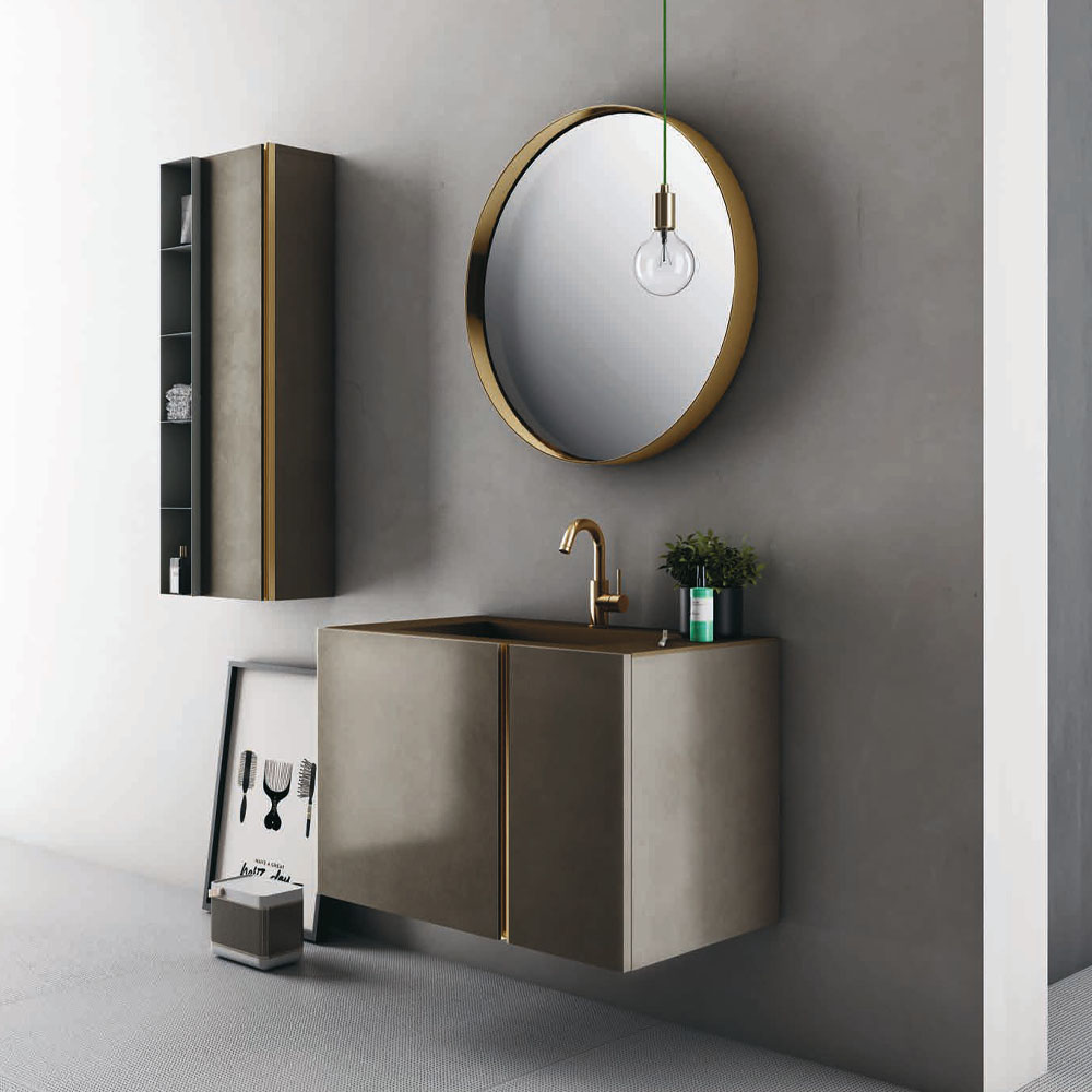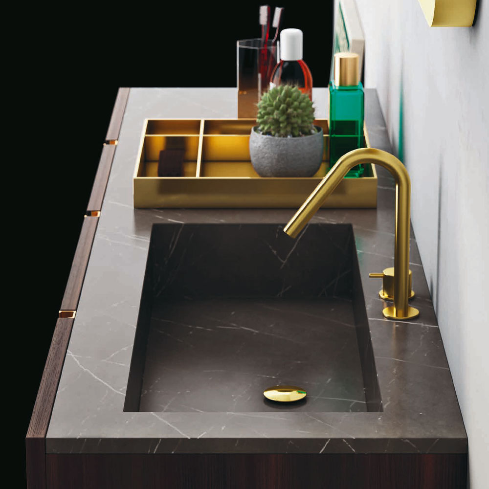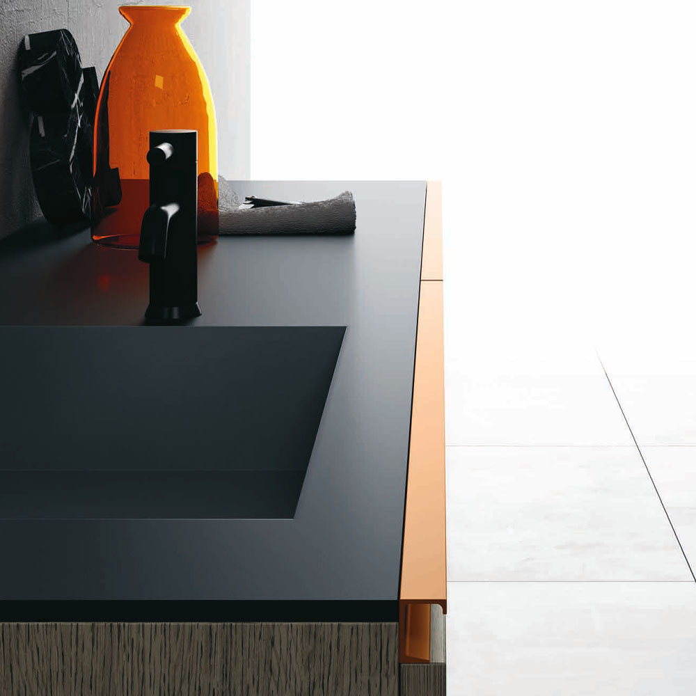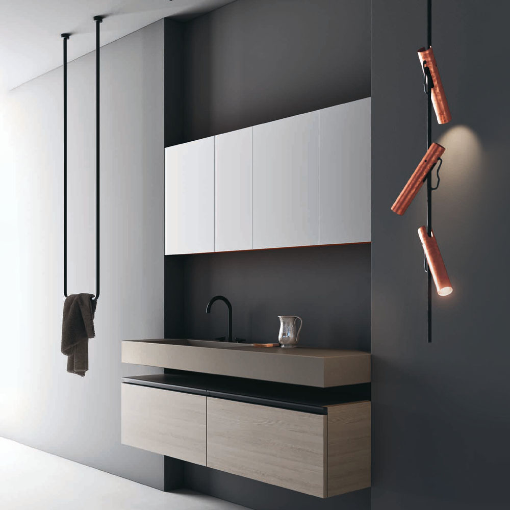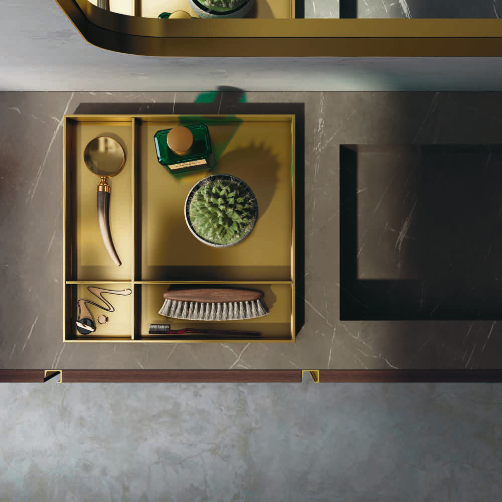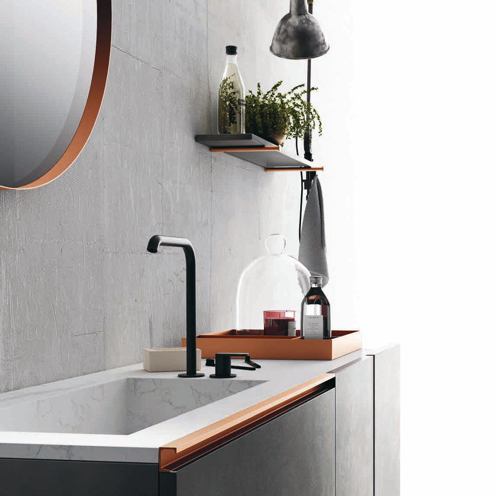 Opera is an extremely refined bathroom furniture set, inspired by the Scandinavian sideboards of the fifties and sixties. A collection entirely based on a single technical detail, treated with consistency, enhanced with modern finishes, and combined with exclusive materials: a handle discovers its own personality and becomes a decoration. The splendor of the brass and copper, along with the free choice of various finishes, have generated countless customizations where the beauty of the finishes and practicality of the furnishings find expression. The minimalist style of Opera is ideal for both the main and guest bathroom. A handle discovers its own personality: an entire collection is born. Exclusive materials and innovative proposals are combined on the back of the principle of minimalist elegance.