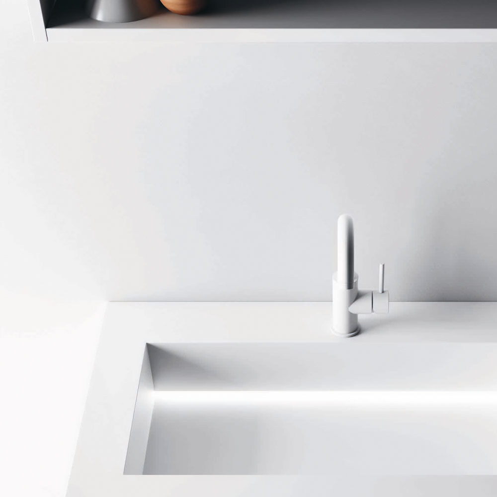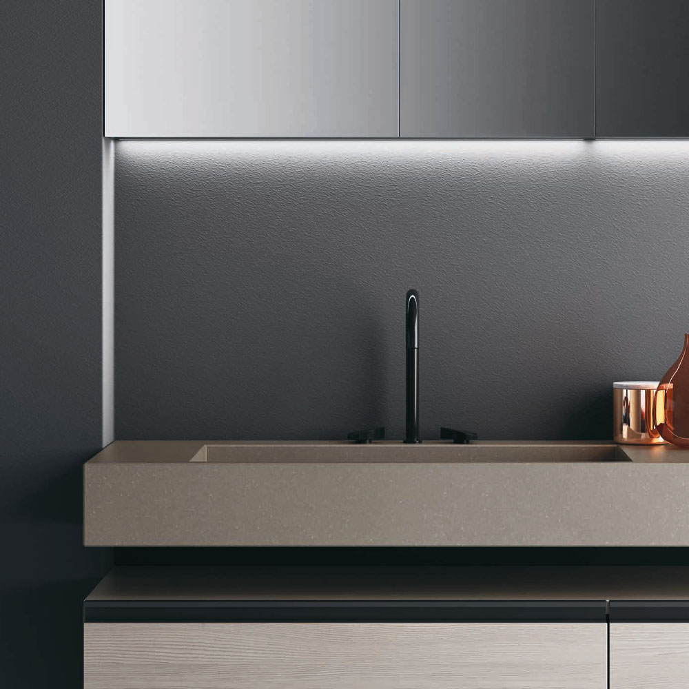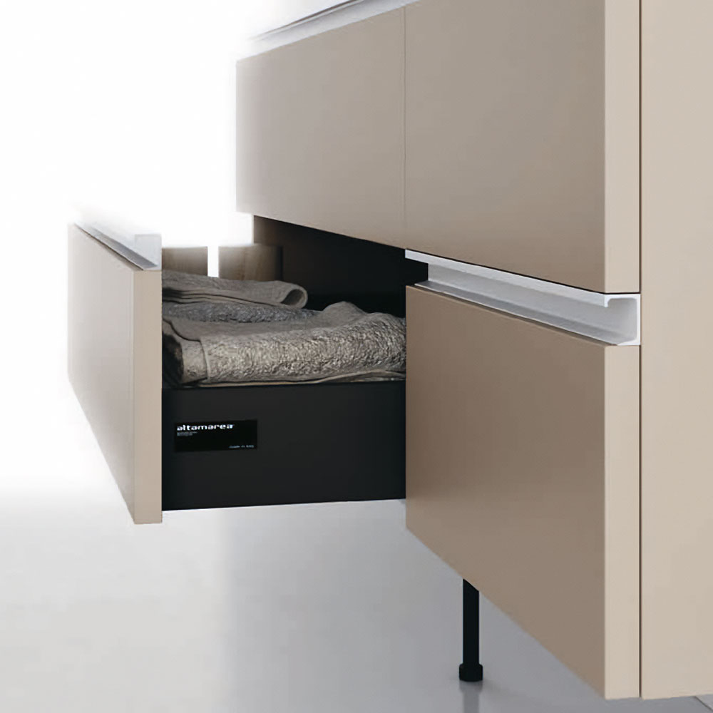 A clean and elegant look, in true Altamarea style, for the utmost practicality of the components. The materials used range from select woods such as Eucalipto Termocotto or Rovere Sabbiato, to Sand, gloss, or Oxidised lacquers, and even technical materials such as Fenix NTM®. All finishes, to which the precious surfaces of the tops are added, are combinable.