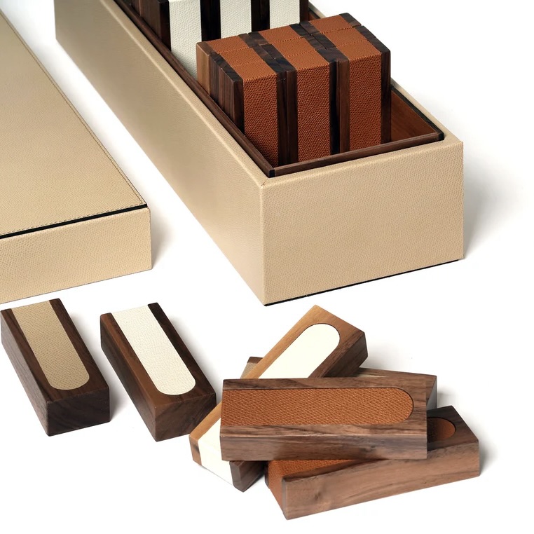 Pisa Tower boasts truly superior craftsmanship with exceptional Italian leather over walnut wood. Fifty-four impeccably handcrafted pawns made of precious canaletto walnut wood, embellished with three leather colors, totally customizable.