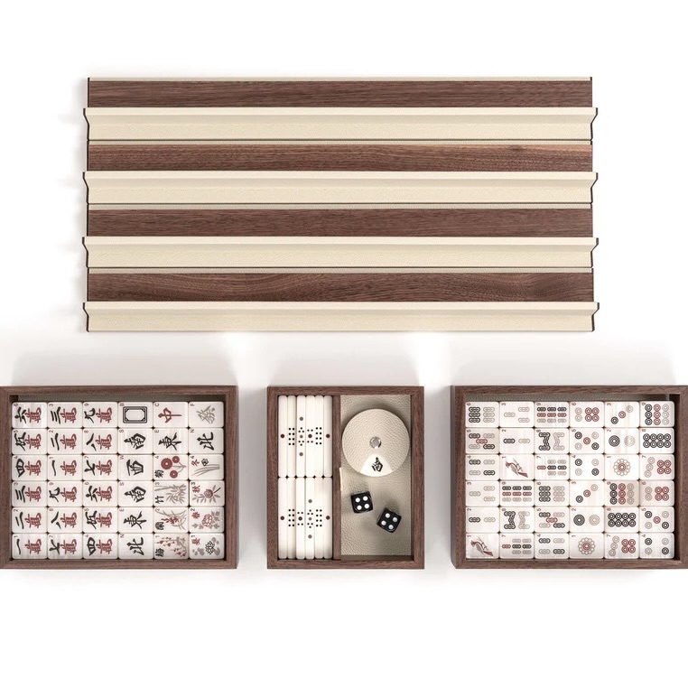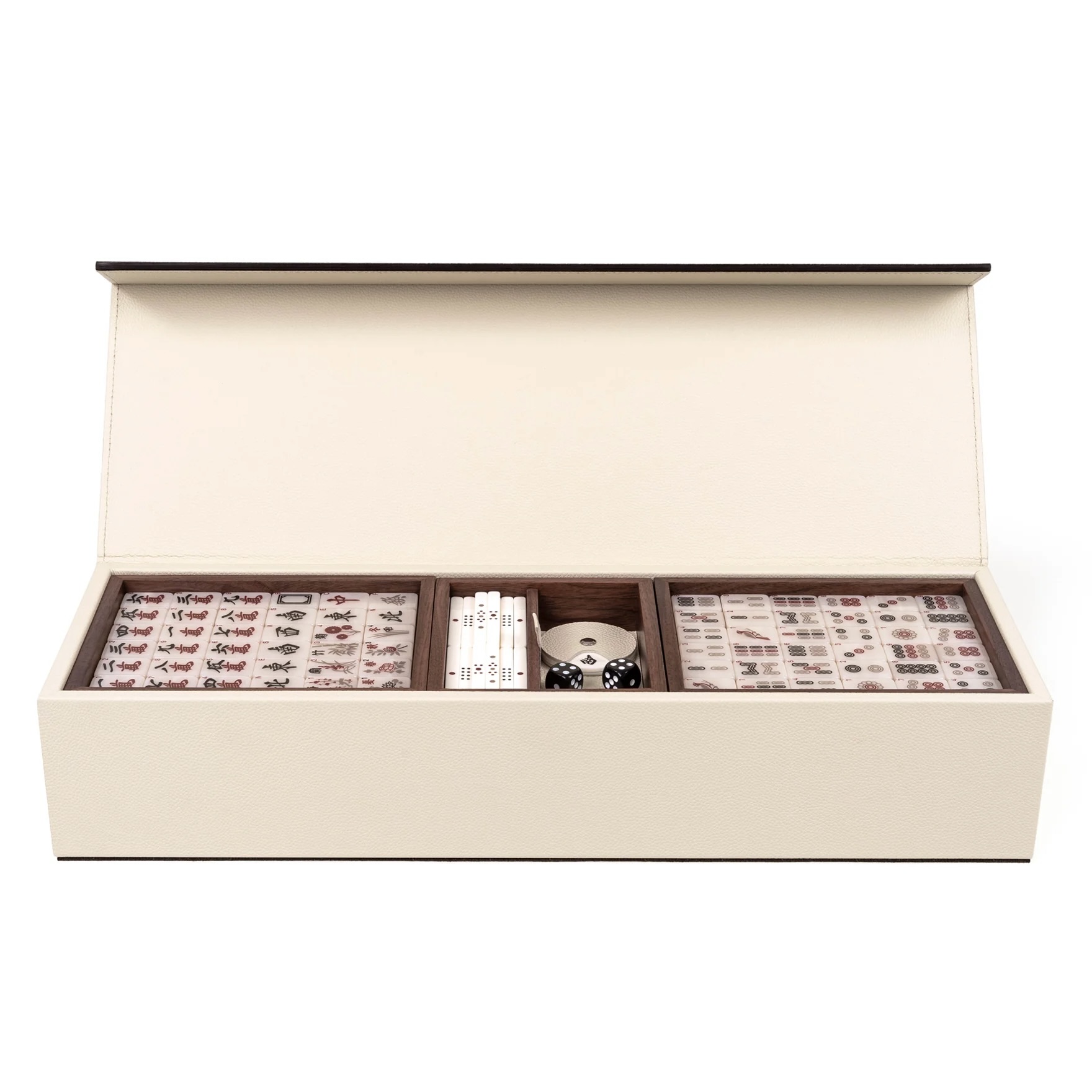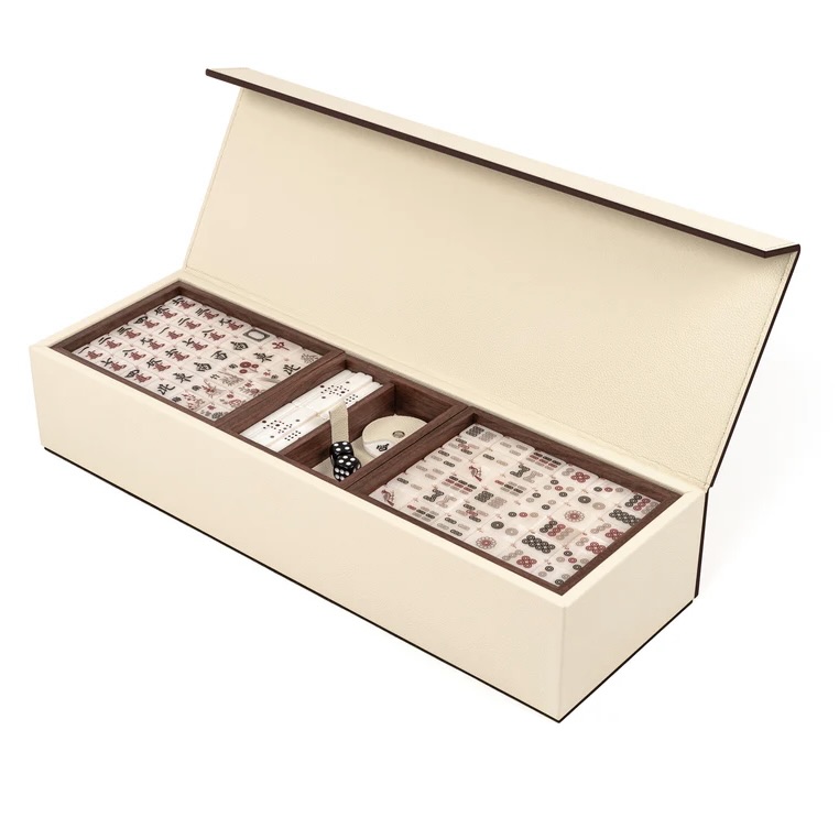 Entirely covered in genuine calf leather, our Mahjong comes in a luxurious wooden box with a magnetic closure lid. The set is composed by 144 pearled tiles, 88 sticks, 4 racks with magnetic removable pushers and a revolving wind indicator.
