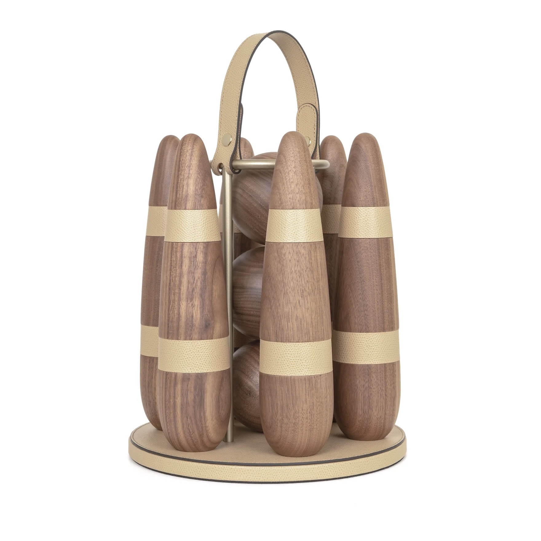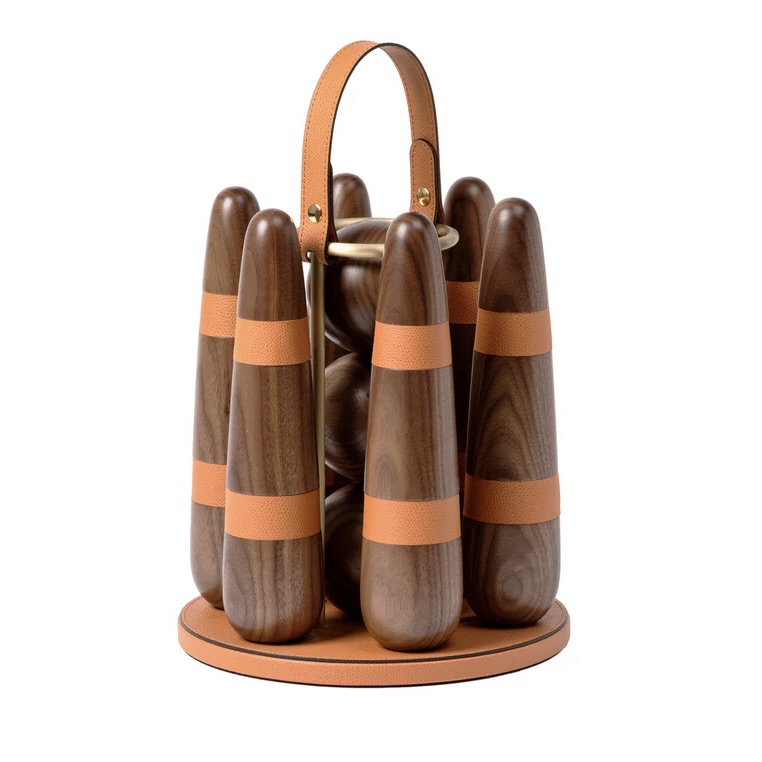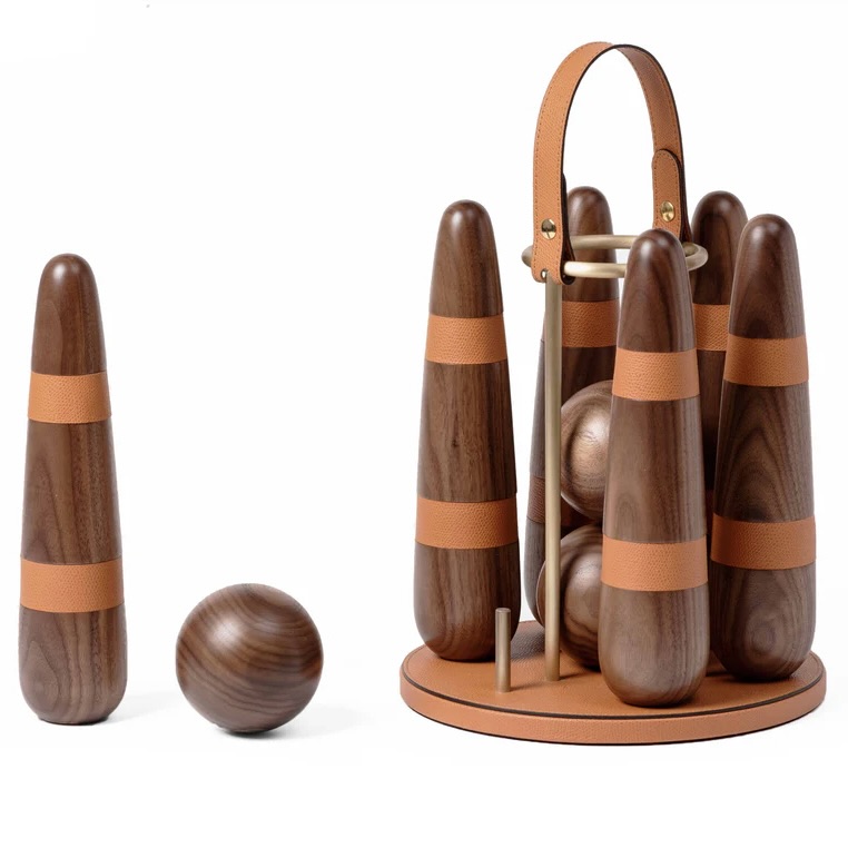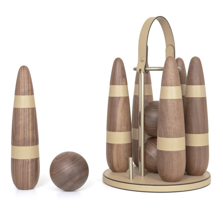 Masterfully handcrafted with precious canaletto walnut wood our portable Bowling set is enriched with leather details and satin brass finish. A sophisticated gift for any age or an ultimate statement piece for your home or office; this bowling indoor version includes three balls and six contemporary pins. Not hard to fall in love with.